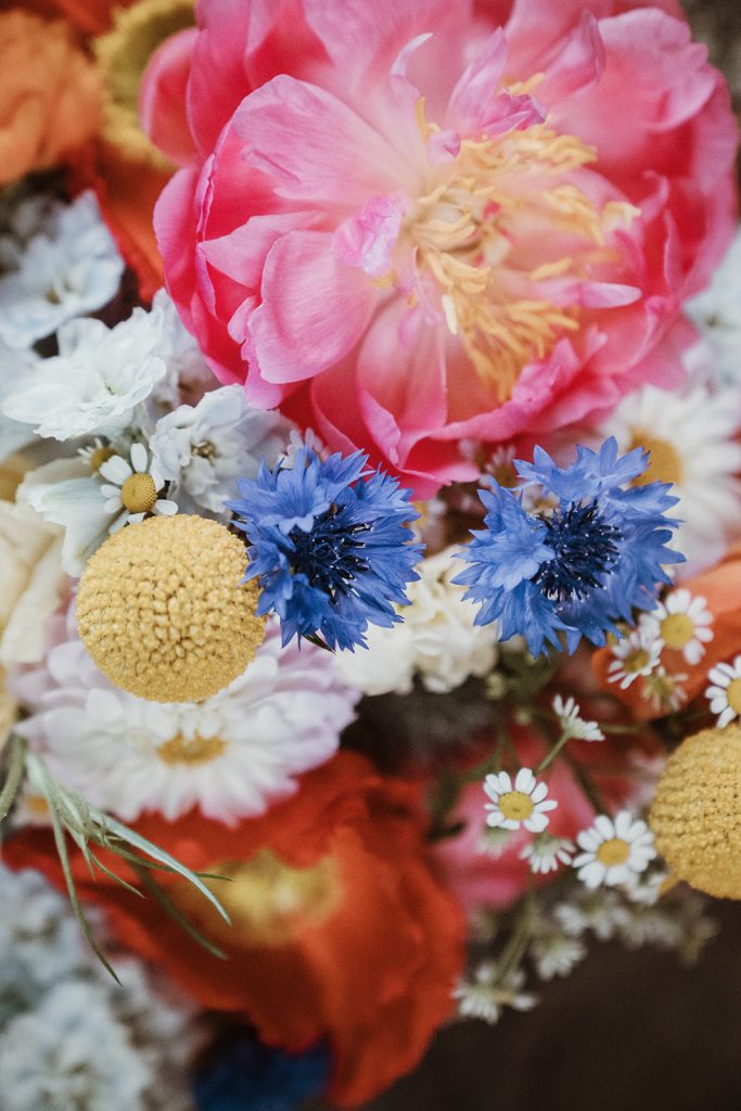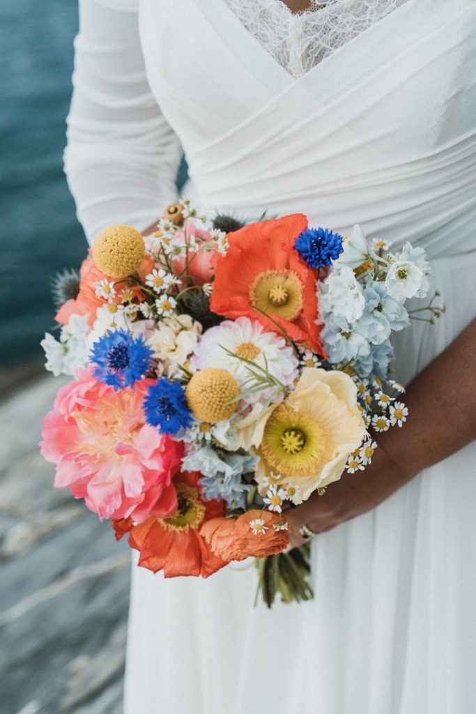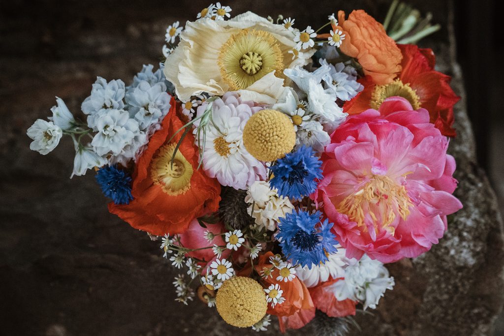 A bright colored wedding bouquet brings an uplifting and cheerful vibe to any wedding, symbolising happiness and excitement. With vivid shades of pink, orange, yellow, and blue, it infuses the ceremony with a sense of fun and optimism. The bold contrasts between the flowers create an eye-catching arrangement that stands out beautifully against the bride’s attire, whether it’s a traditional gown or something more modern. A bouquet filled with bright colors not only enhances the aesthetic but also reflects the vibrant energy of the day, making it a joyful expression of the couple’s love and their adventurous spirit.