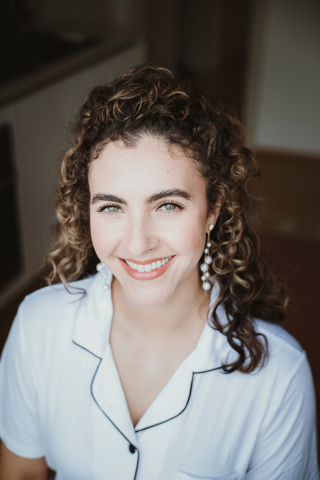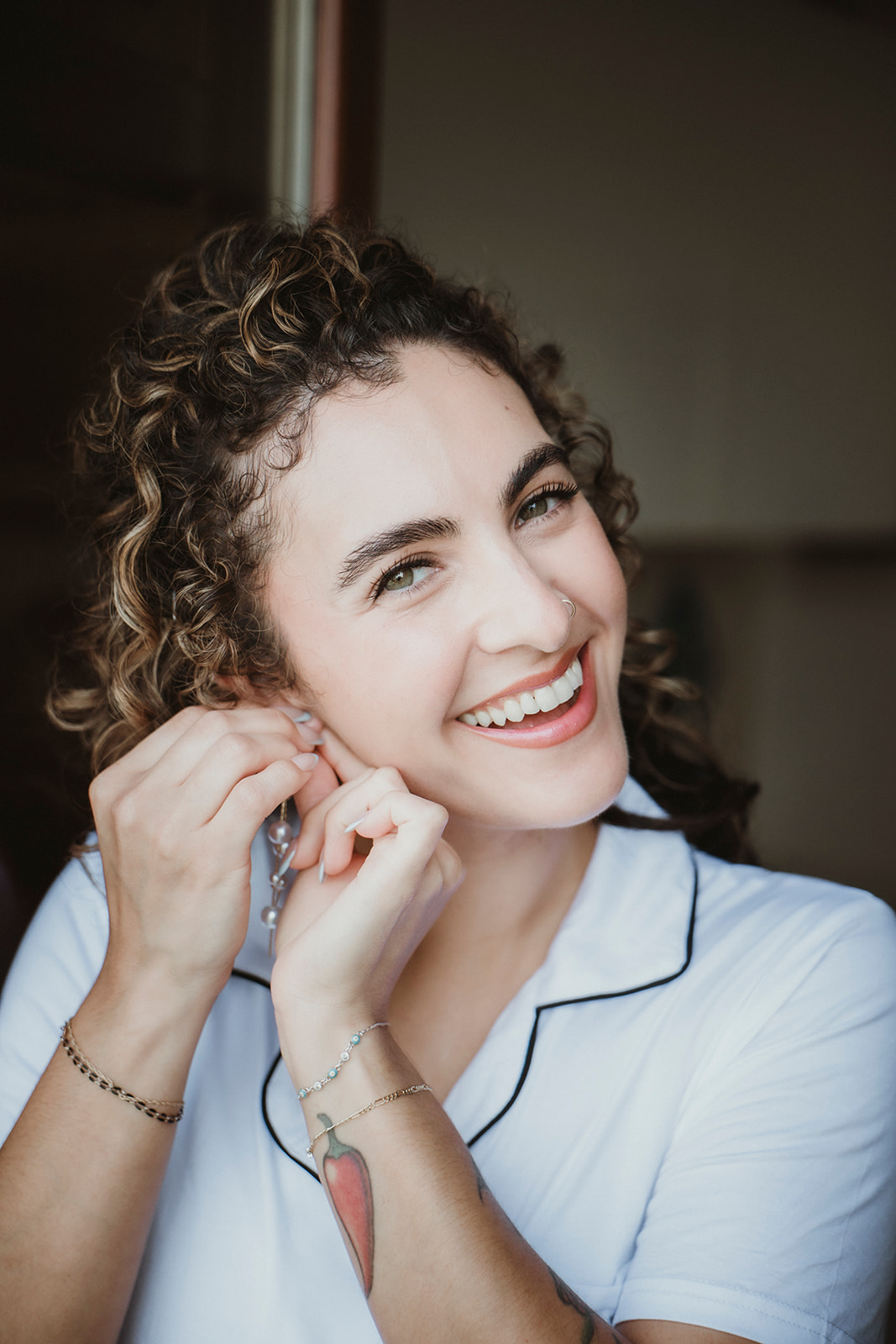 Bride smiling at the camera as she puts her earings on on her elopement in Cefalù, Sicily