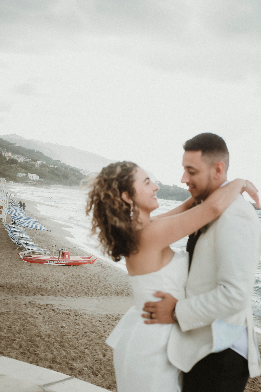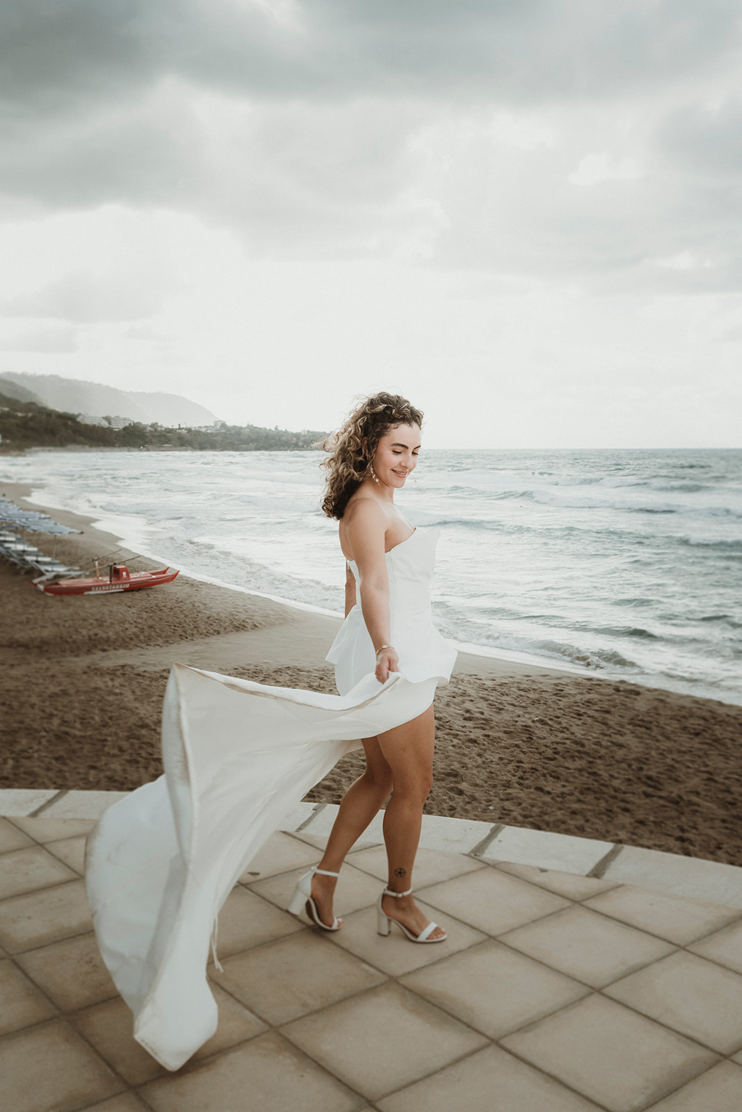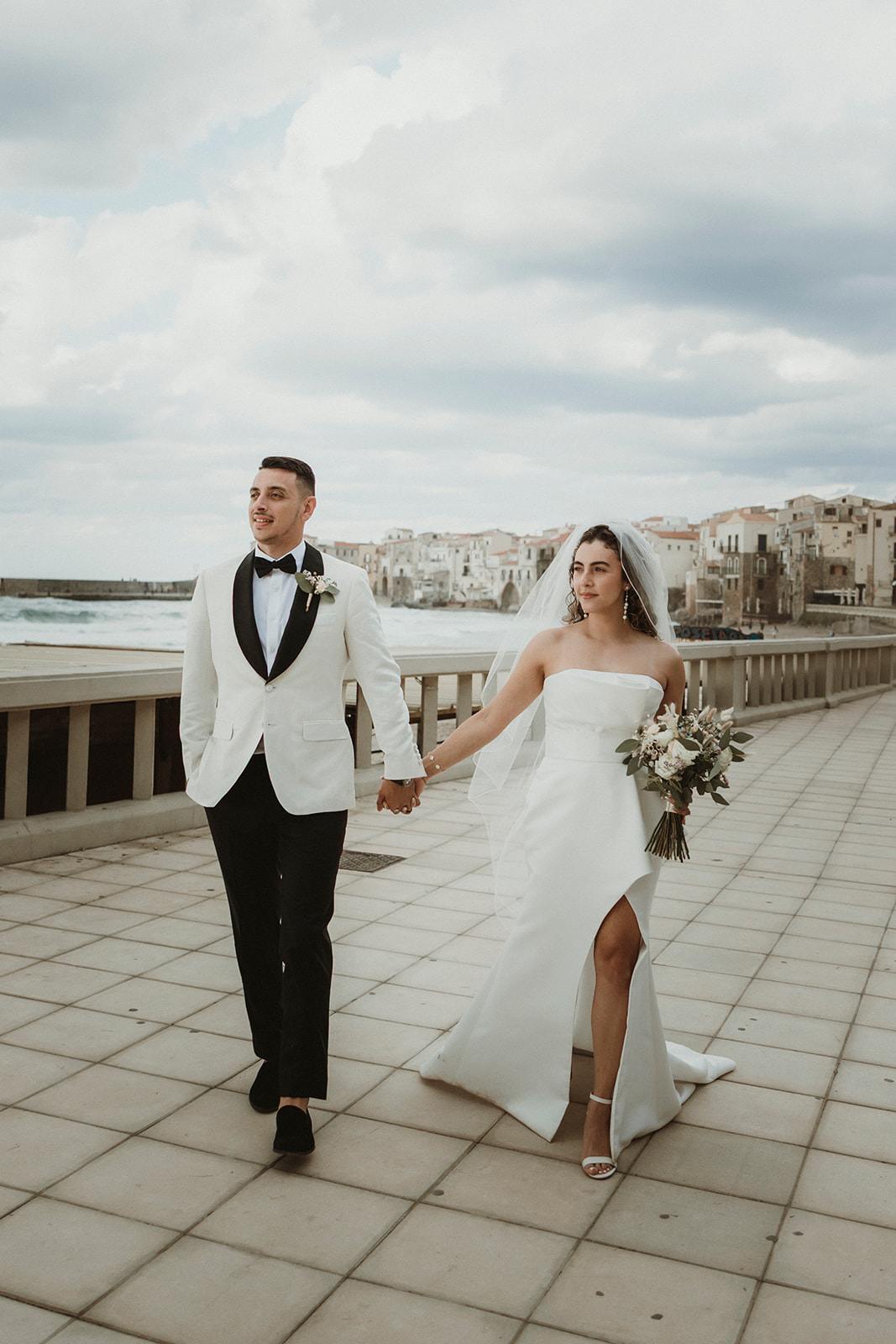 Intimate elopement portraits by the Cefalù seafront after changing weather