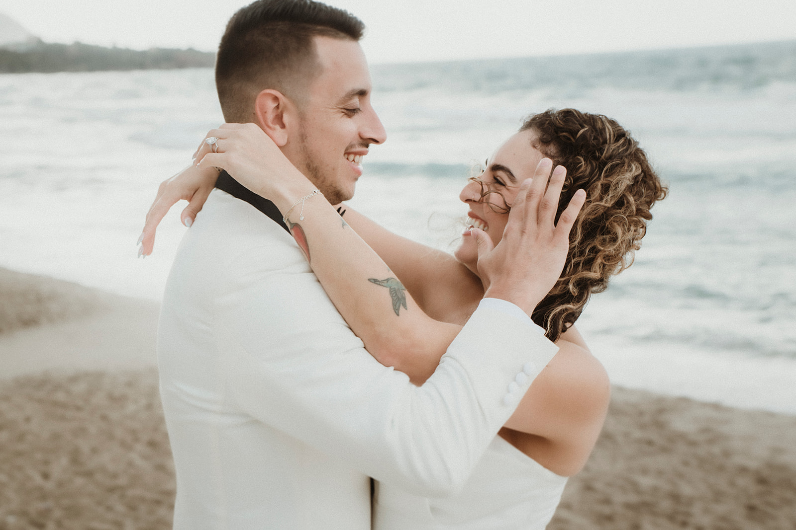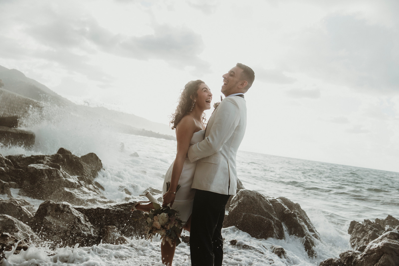 Close-up elopement portrait with couple laughing as they are caught by waves in Sicily
