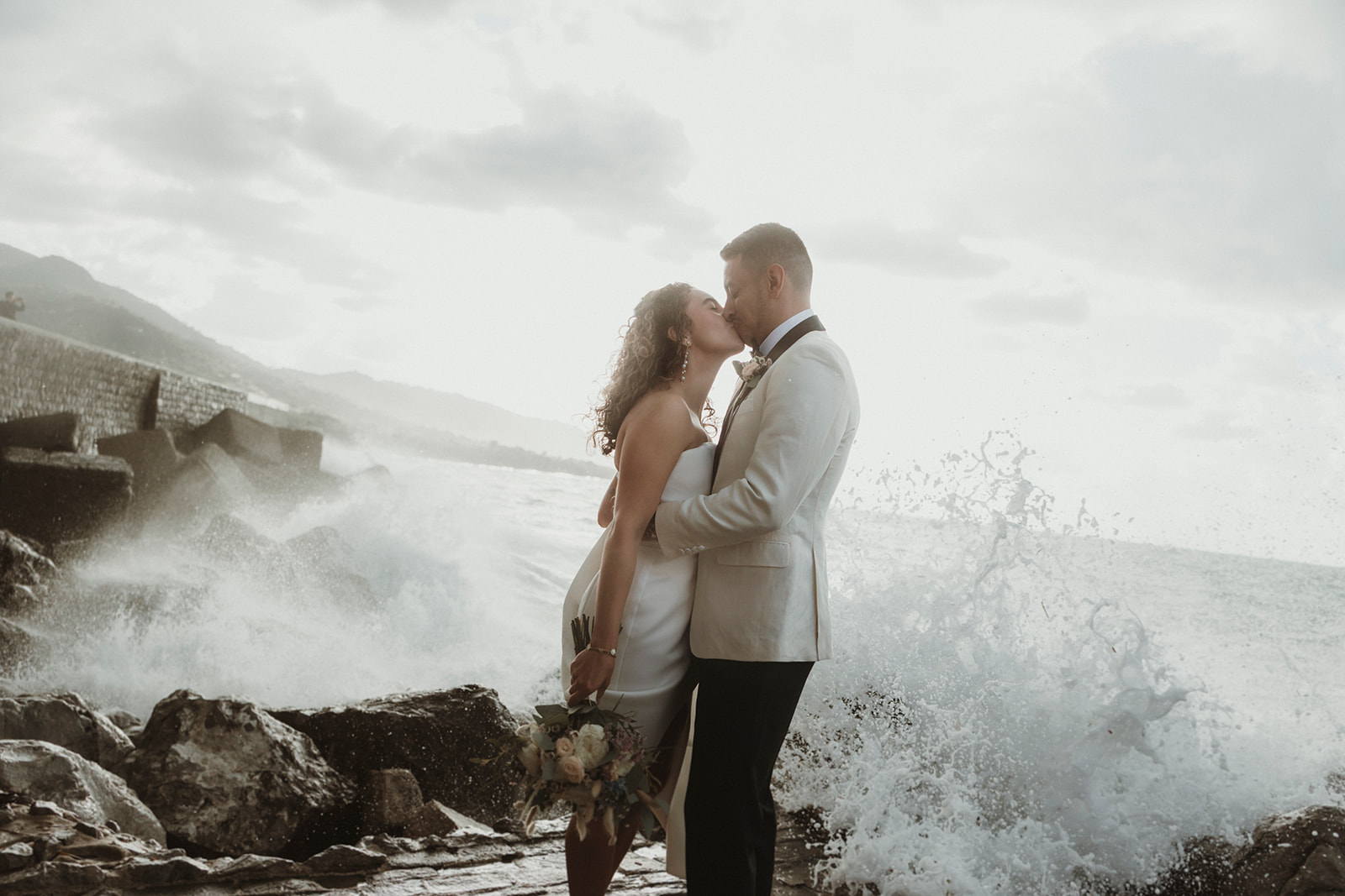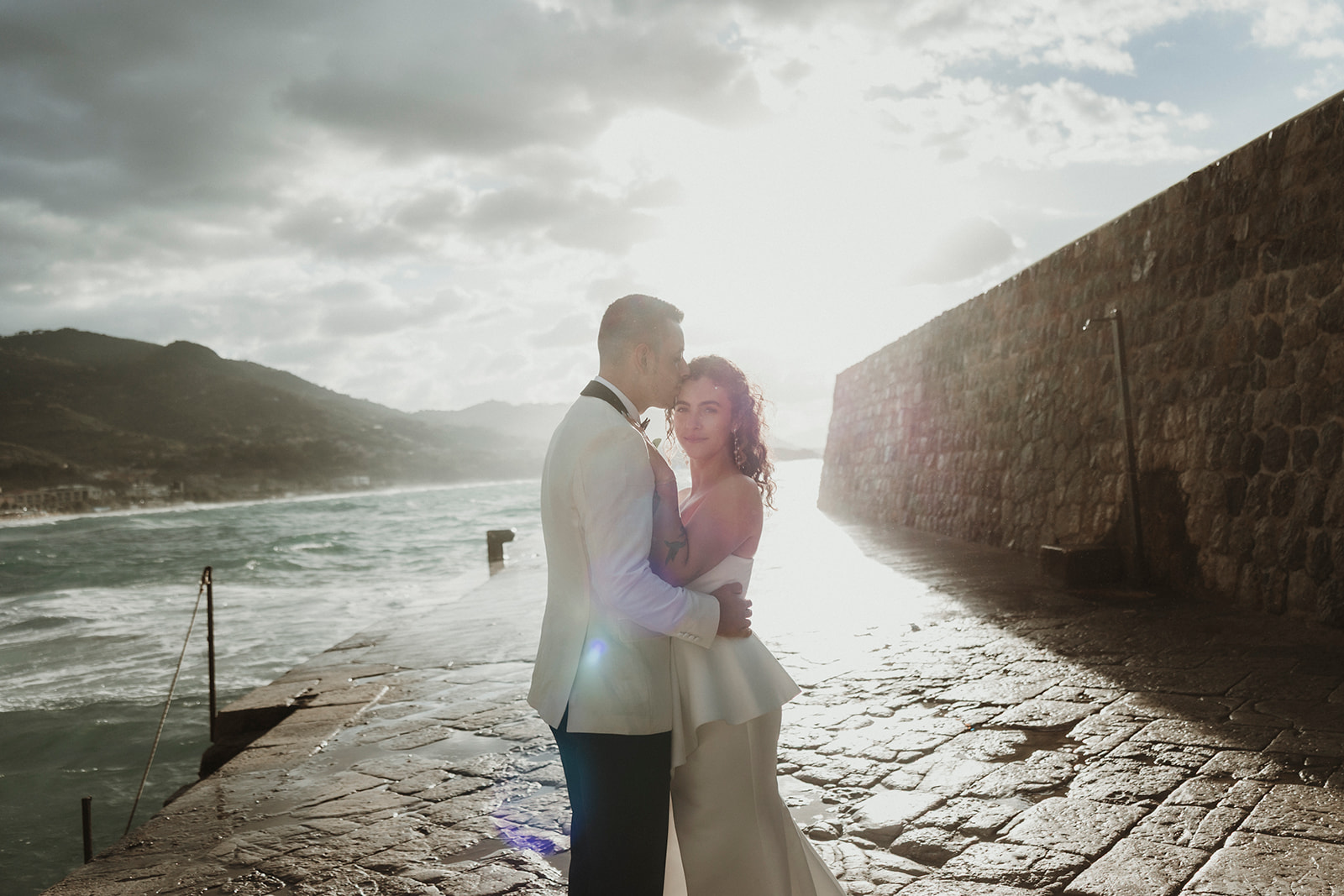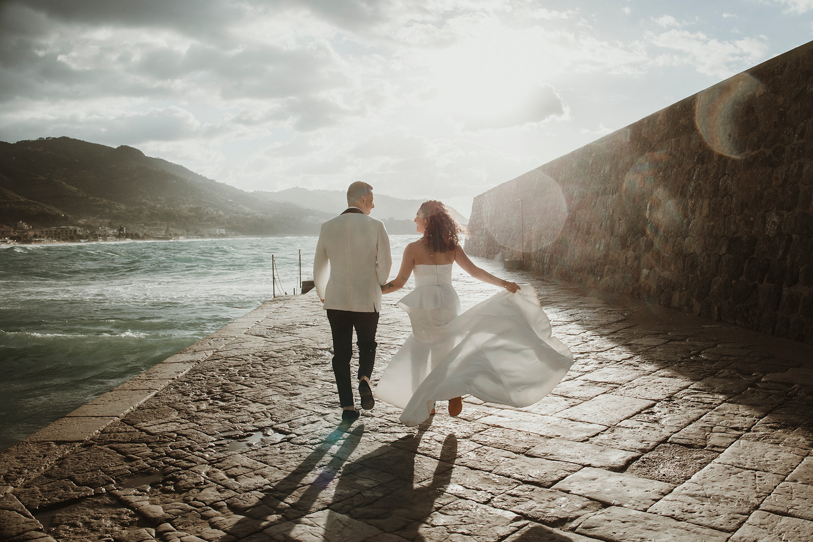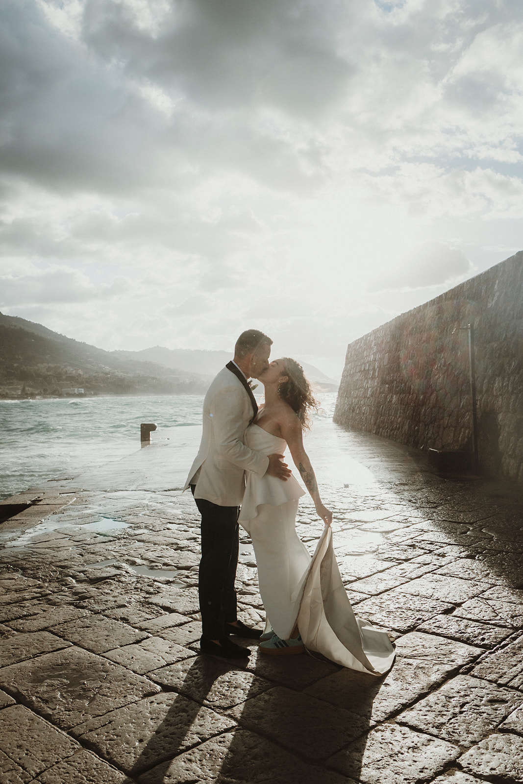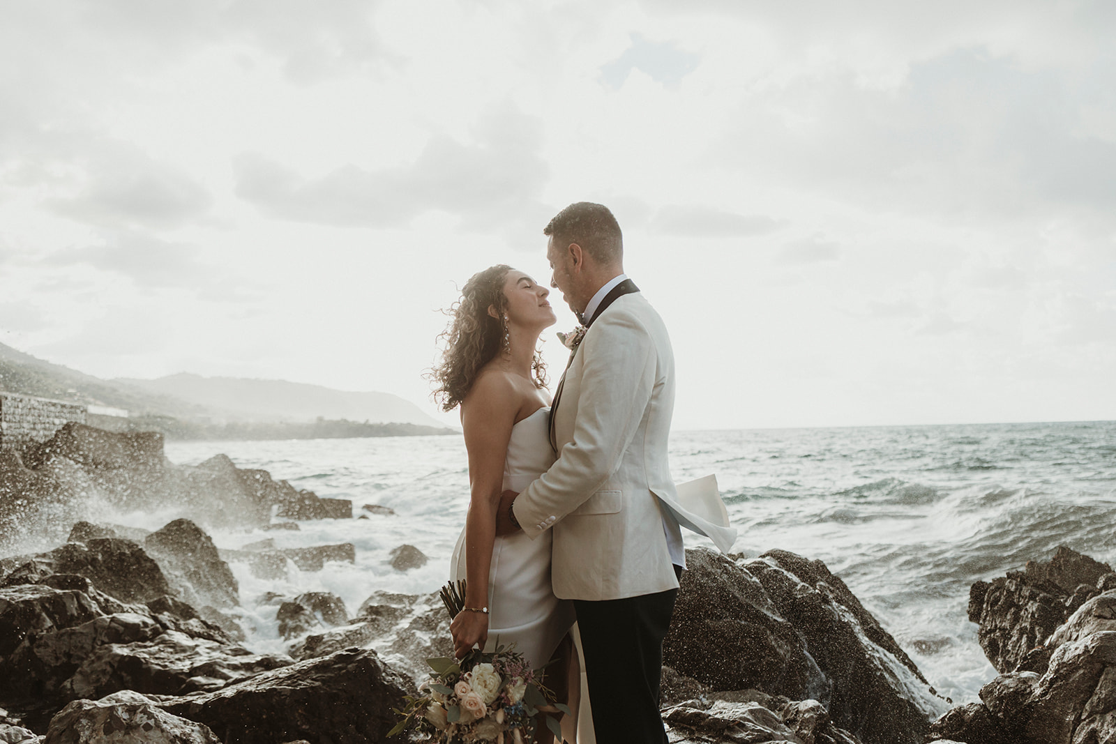 Elopement couple by the sea in Cefalù with dramatic coastal light and wind