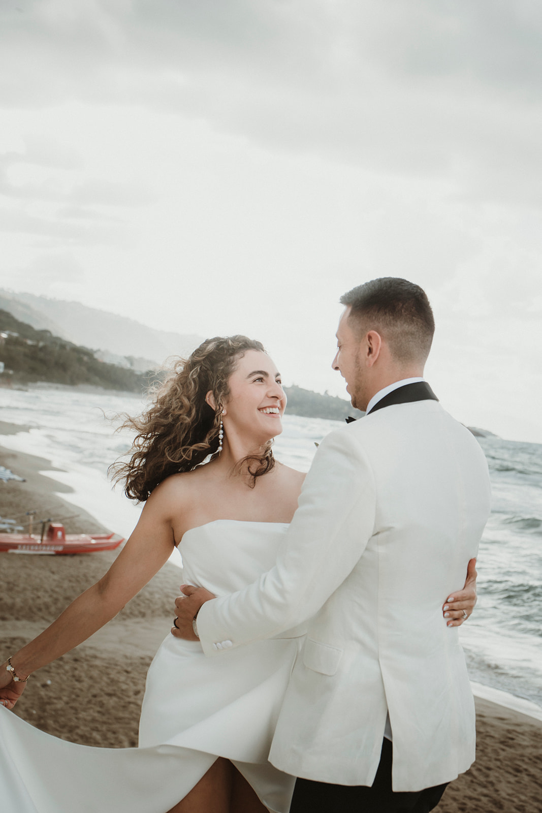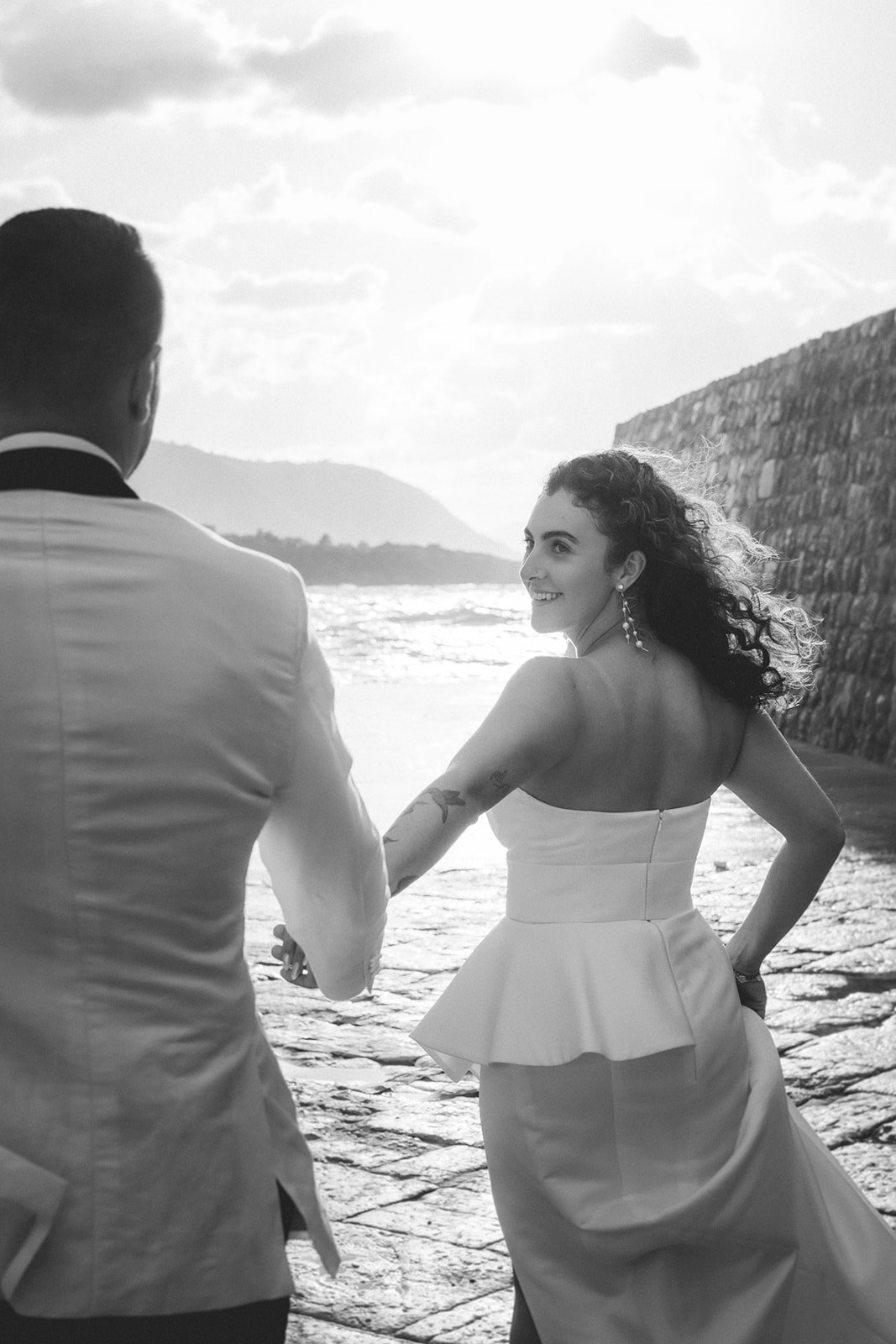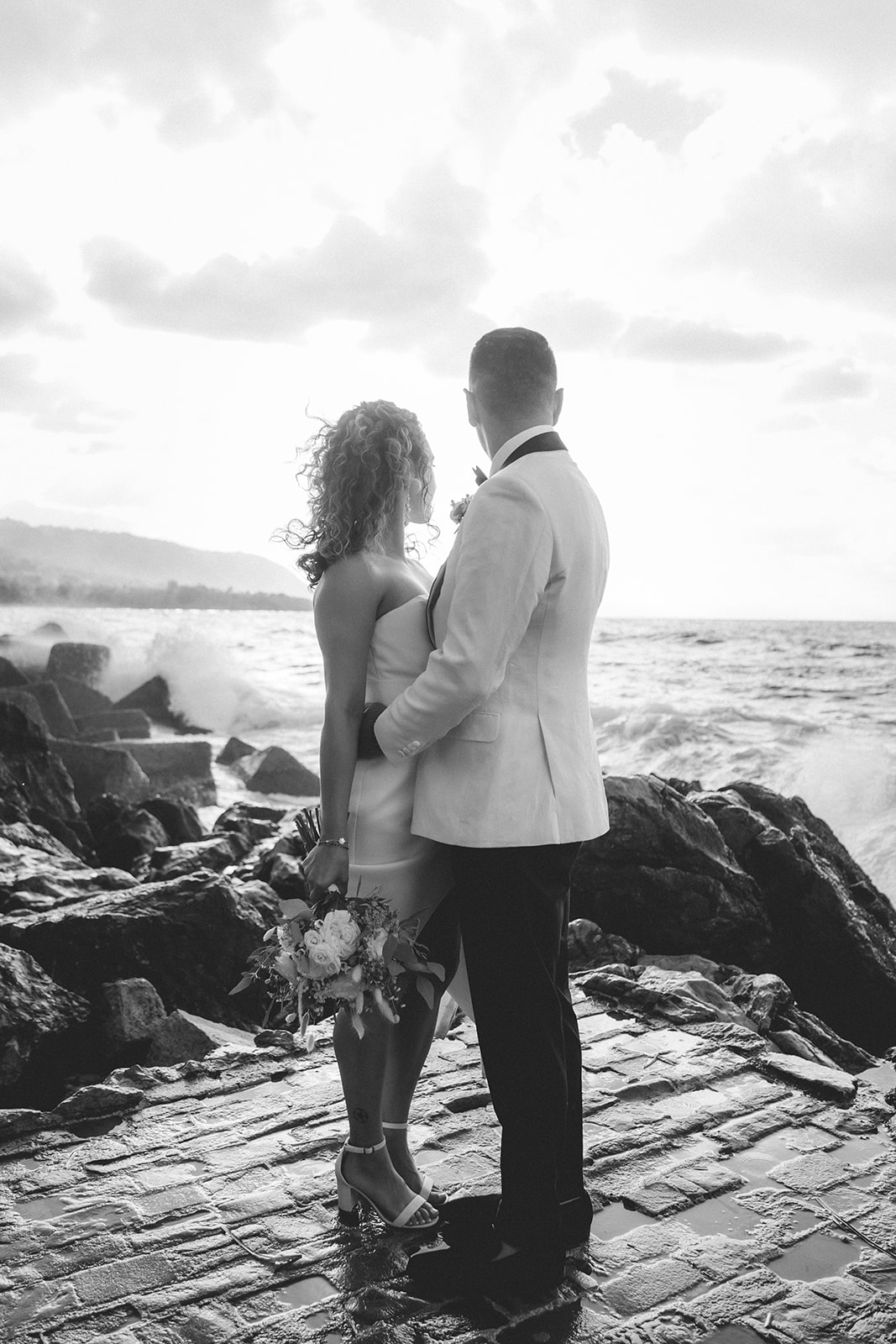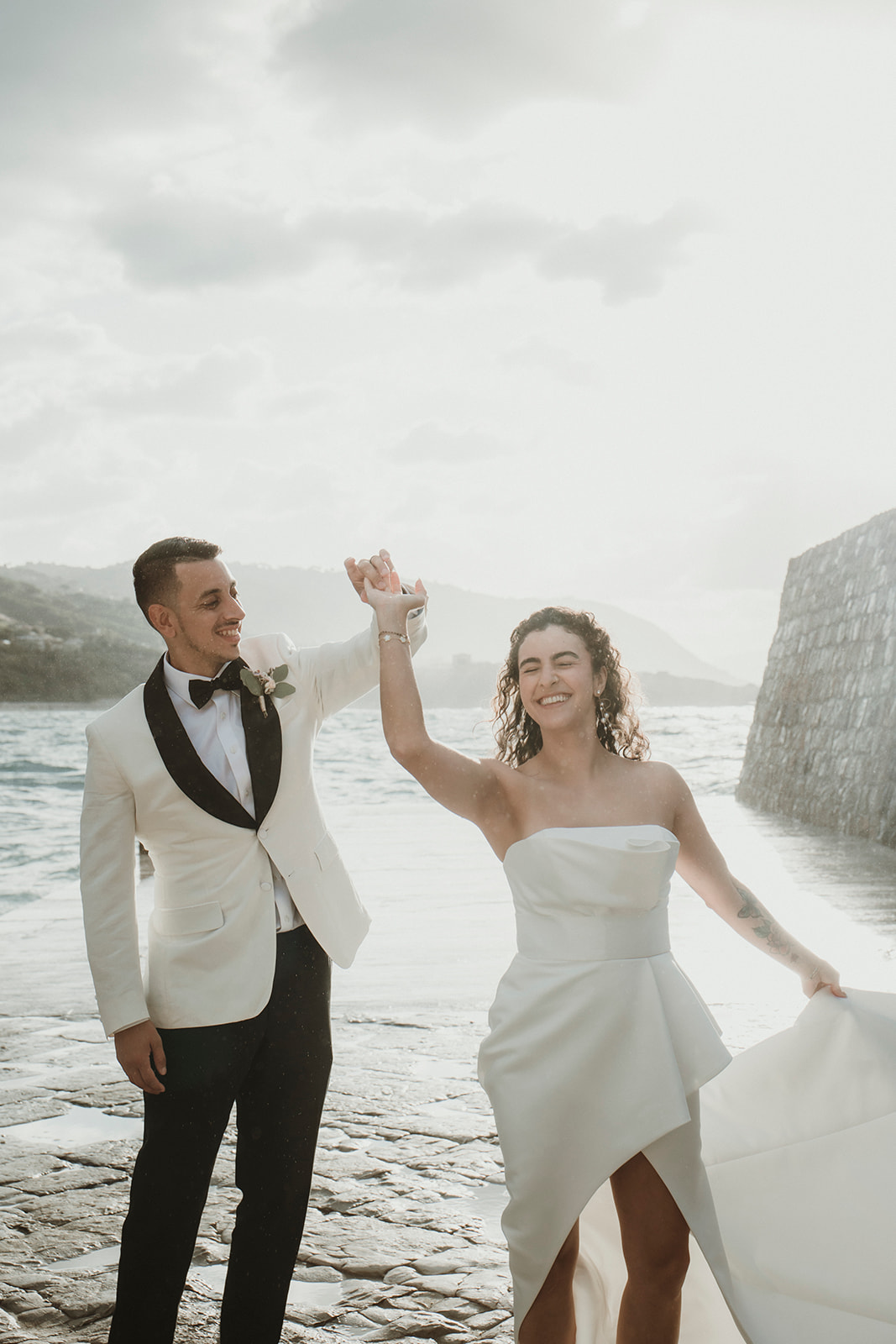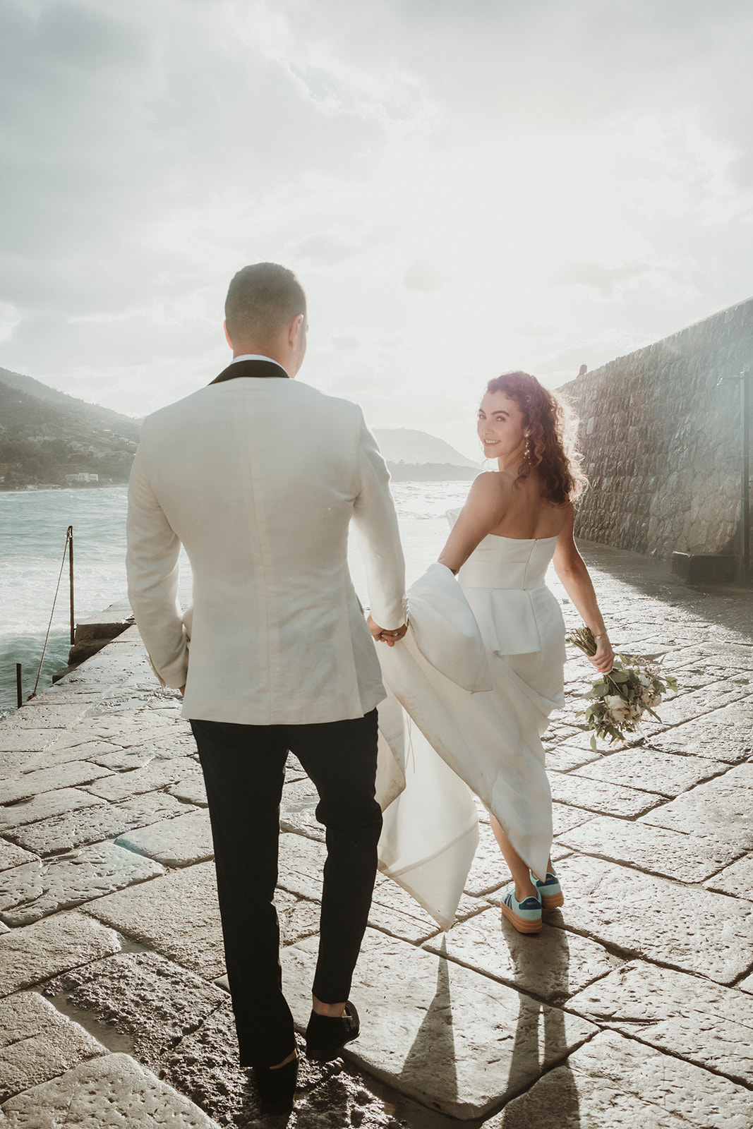 Elopement couple by the sea in Cefalù with dramatic coastal light and wind