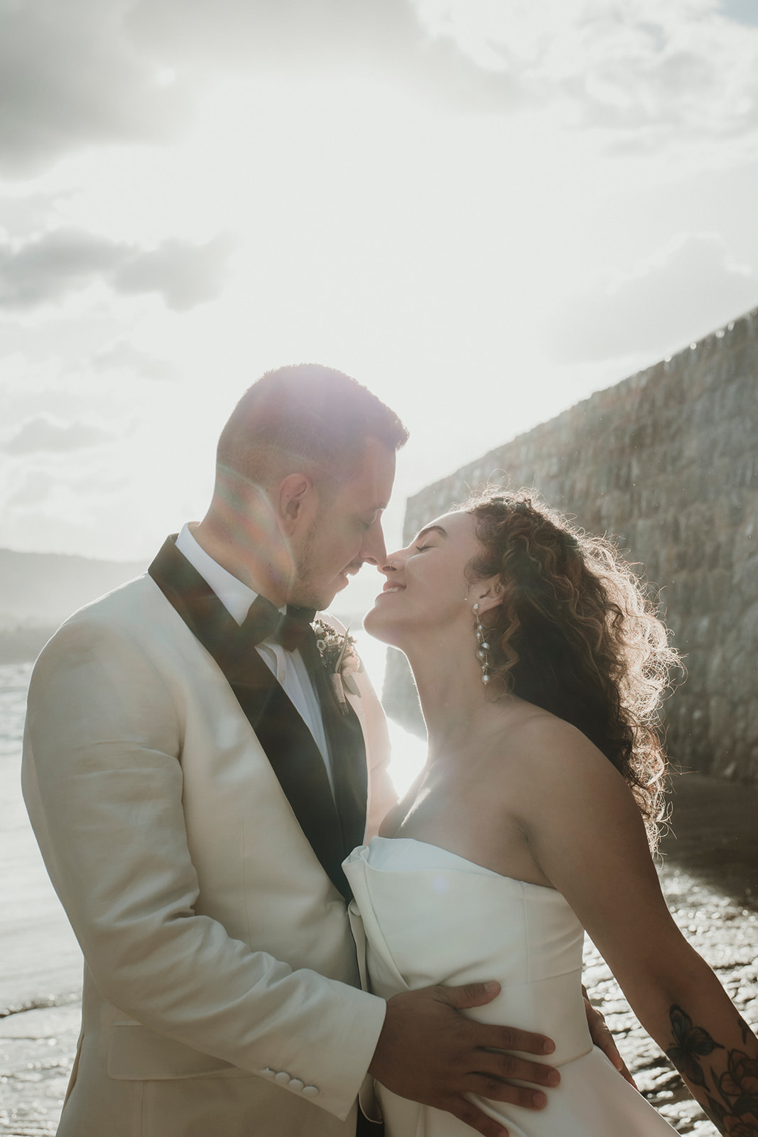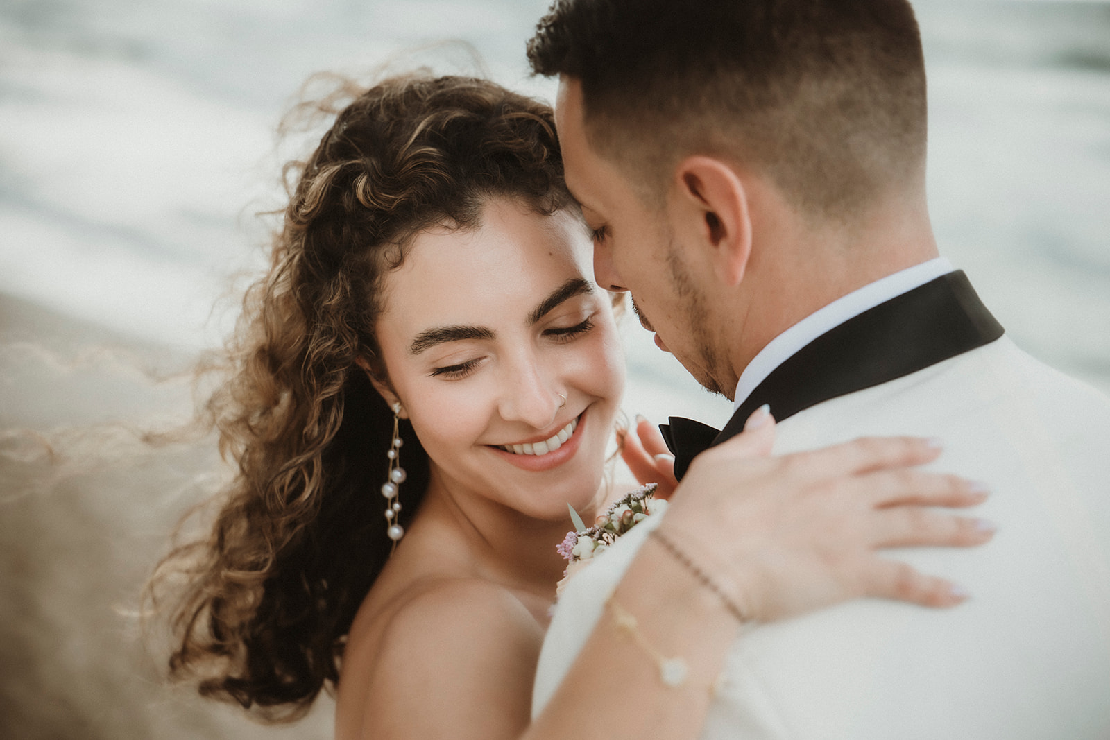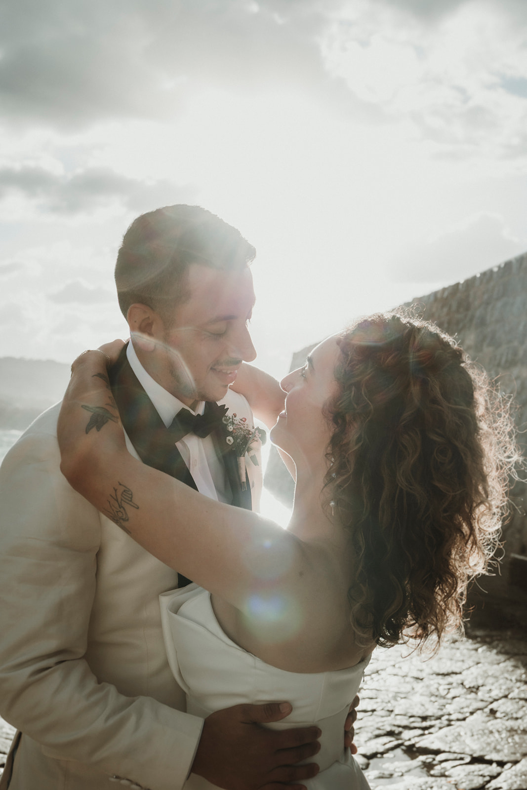 Close-up elopement portrait with wind and natural light in Sicily