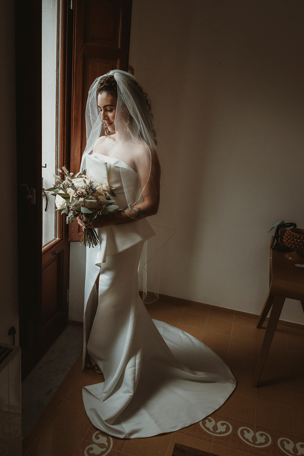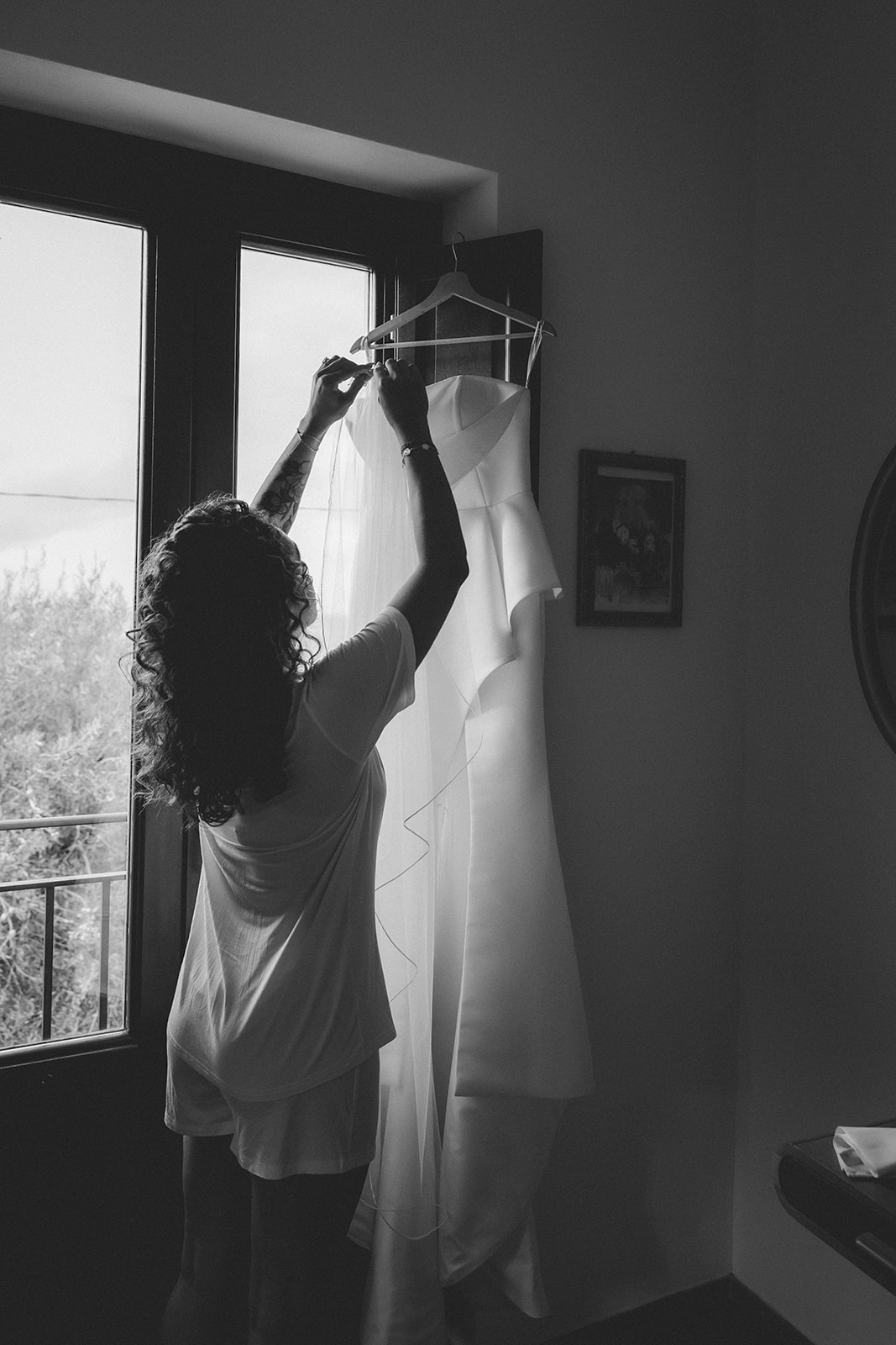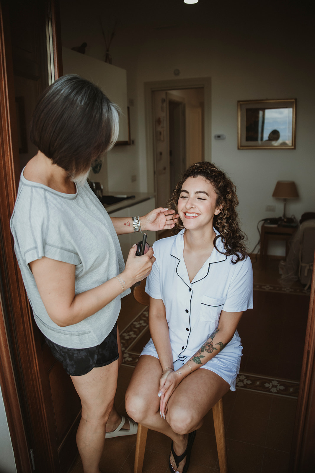 Jess got ready at the villa, surrounded by her closest people, with her sister doing her hair and makeup. There was no rigid timeline, no rush from one moment to the next — just quiet conversations, shared anticipation, and that calm energy that comes when everyone feels comfortable in the same space.