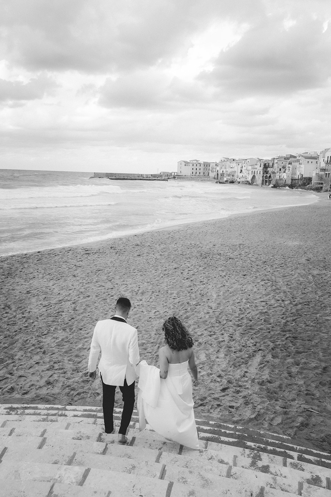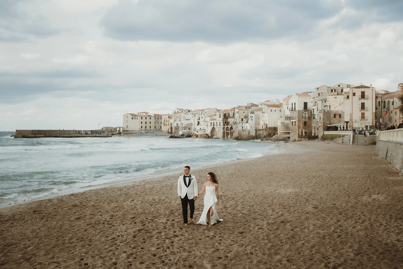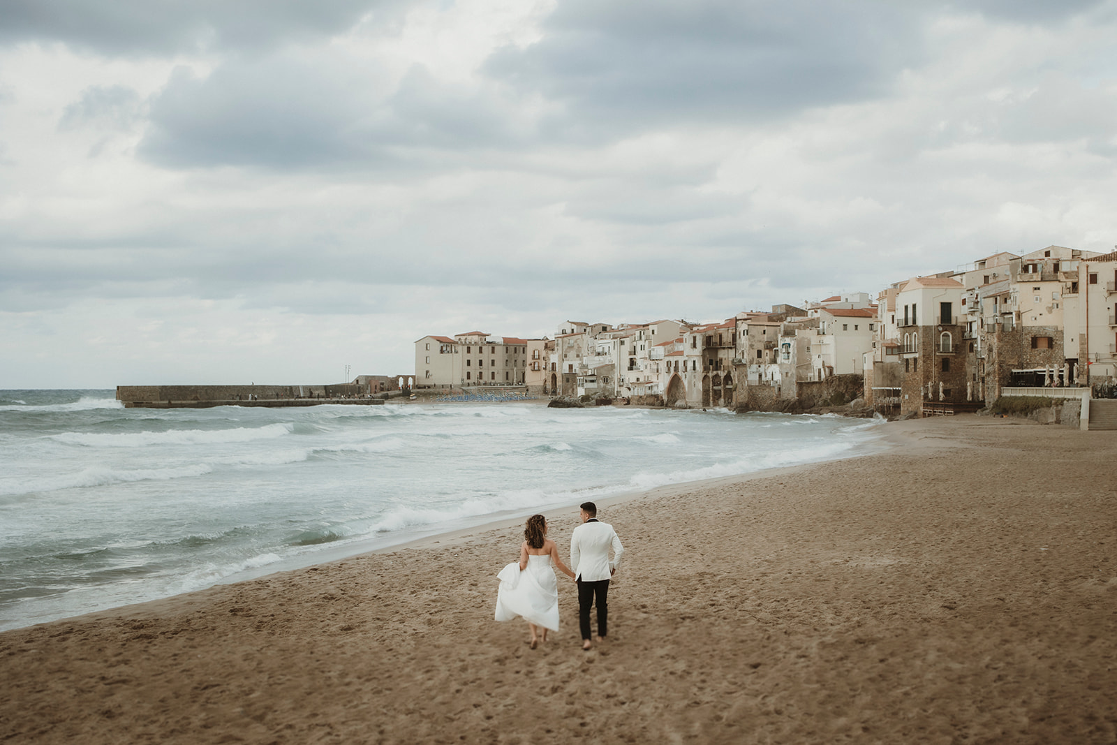 Elopement couple walking along Cefalù beach with historic town in the background