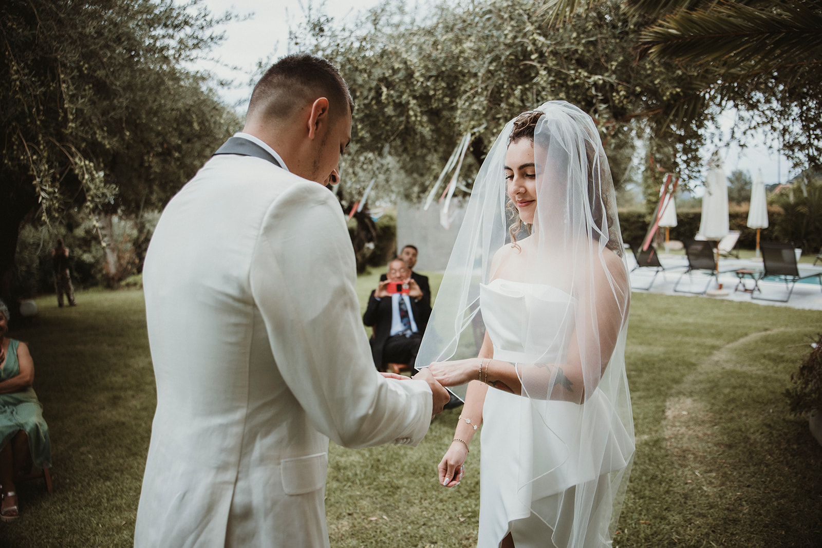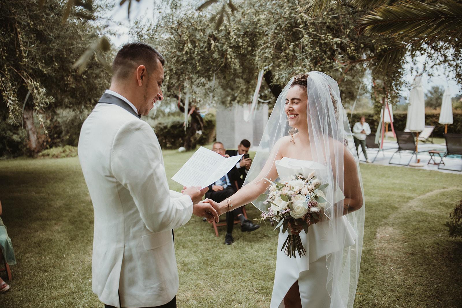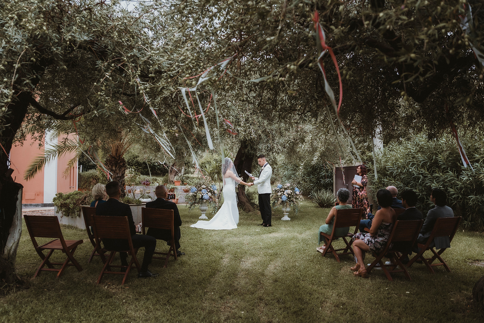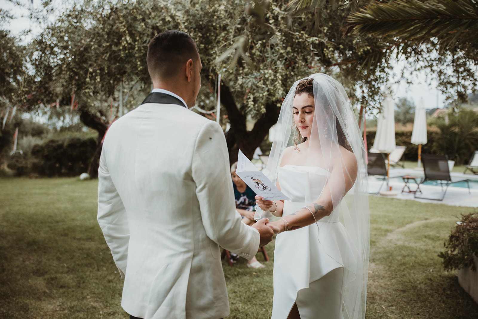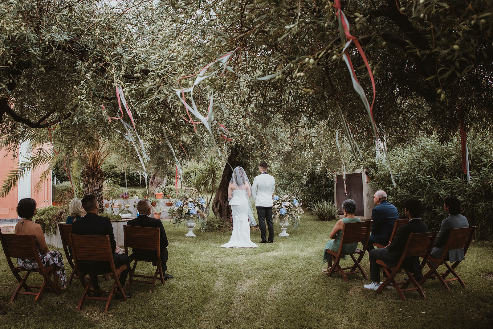 The ceremony itself was symbolic and personal, held in the garden of the villa with their family gathered around them. No rows, no aisle, no expectations — just presence. It felt intimate in the truest sense of the word, grounded in connection rather than tradition.