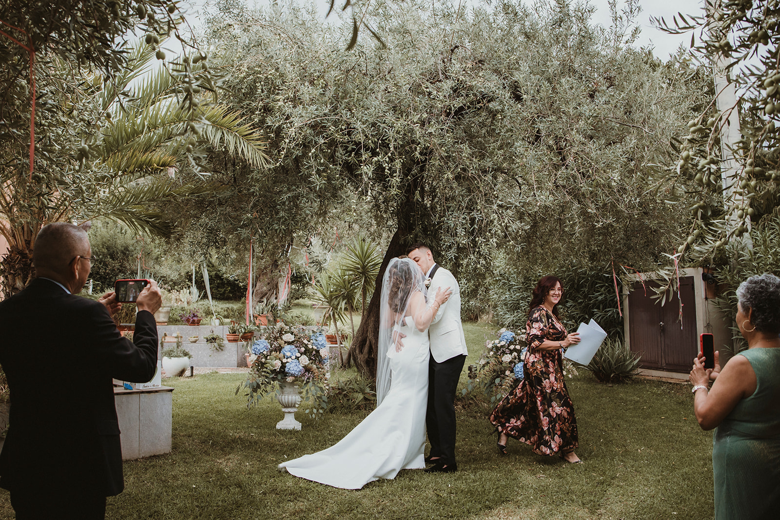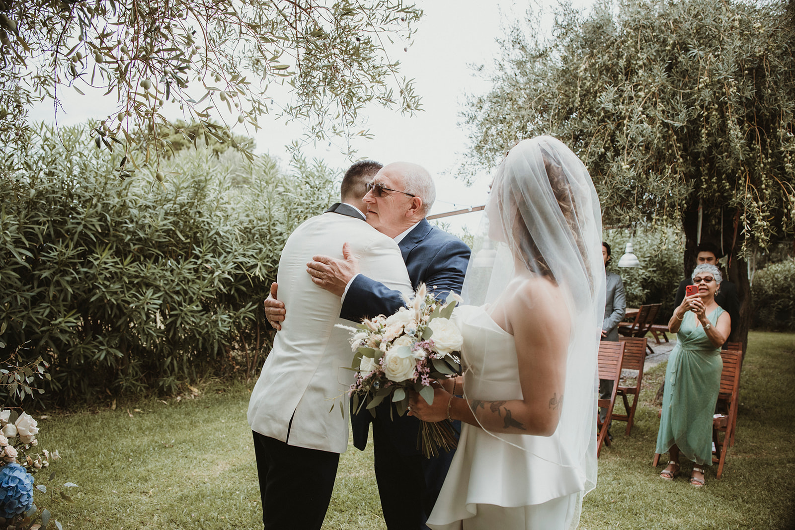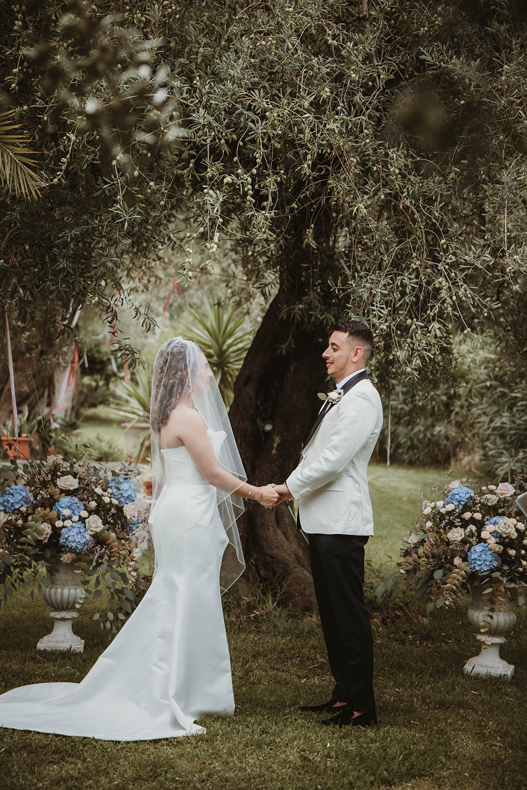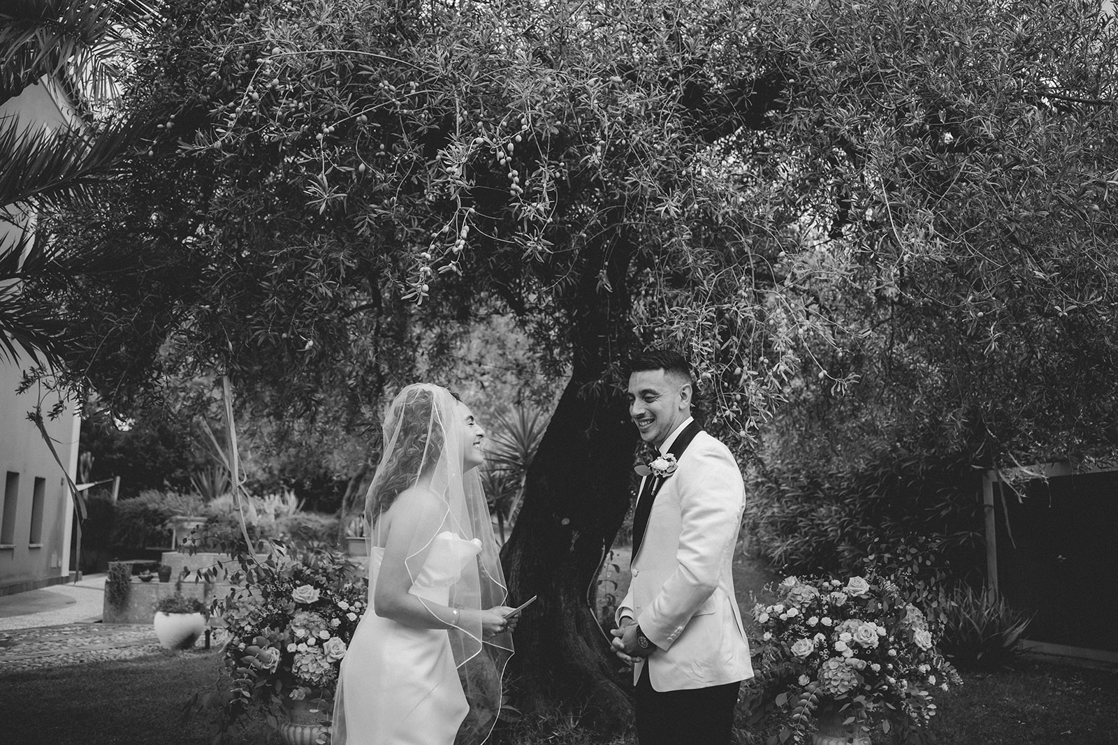 The ceremony itself was symbolic and personal, held in the garden of the villa with their family gathered around them. No rows, no aisle, no expectations — just presence. It felt intimate in the truest sense of the word, grounded in connection rather than tradition.