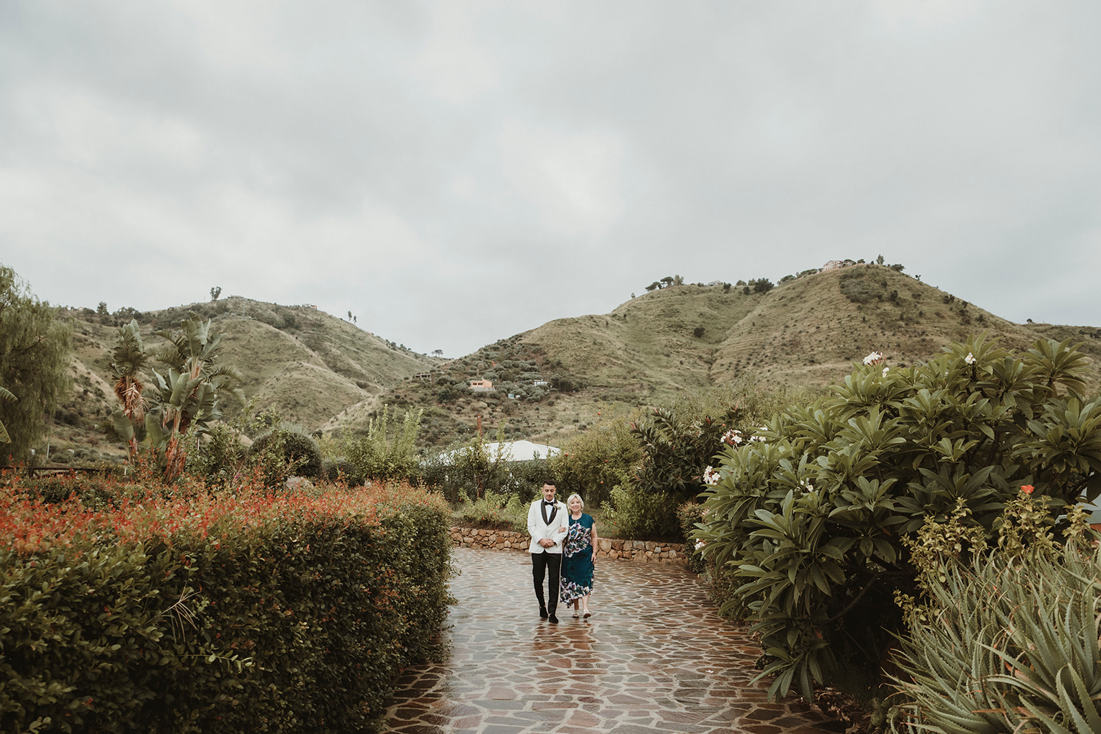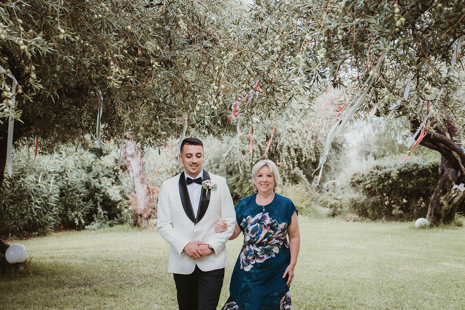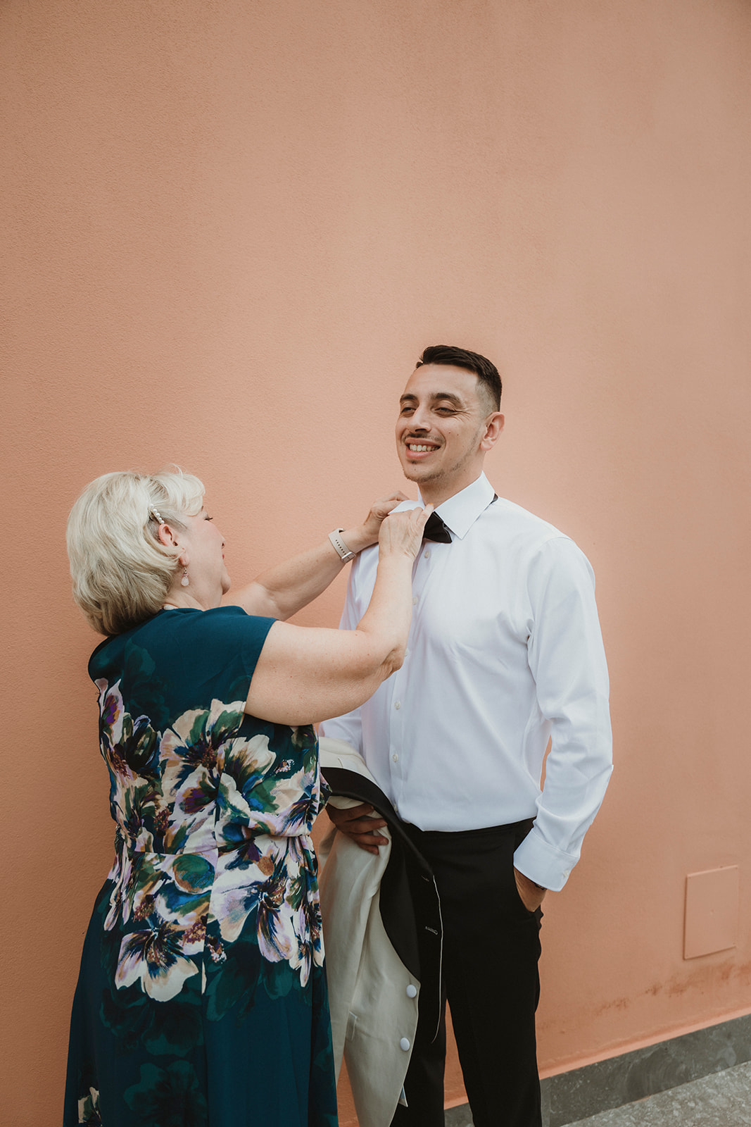 Groom ready to walk down the aisle with his mother just before a symbolic ceremony in the gardens of a villa in Cefalù