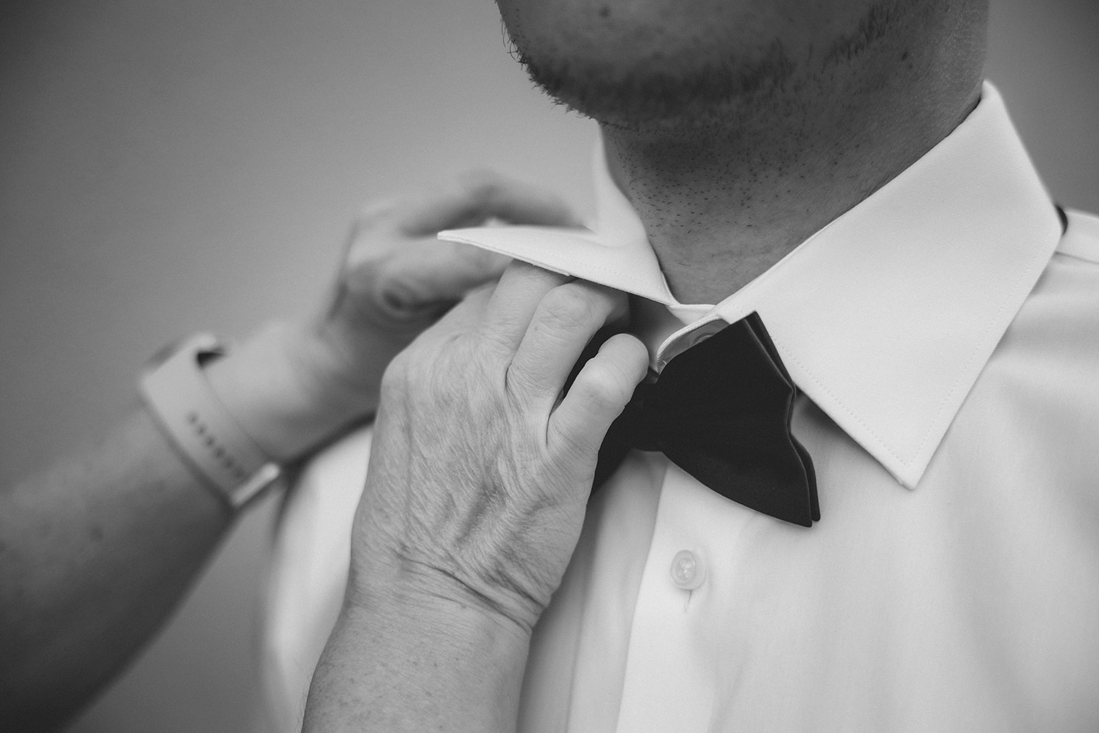 Deatail shot in black and white of the bridal dress for this family wedding