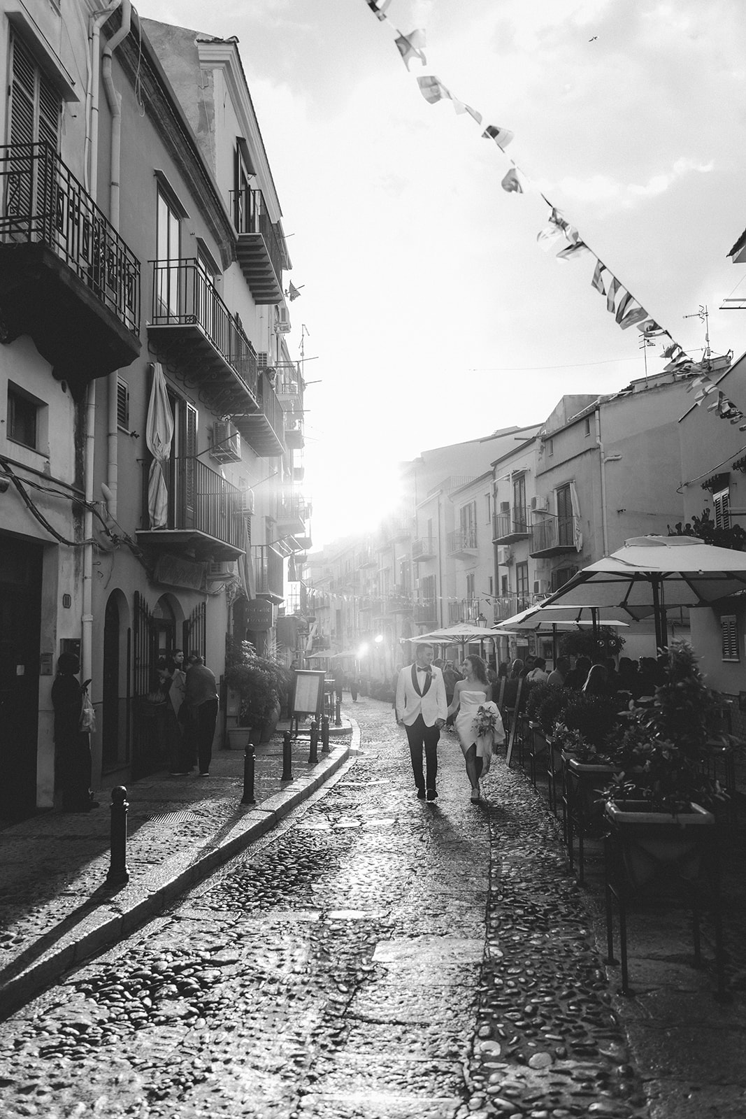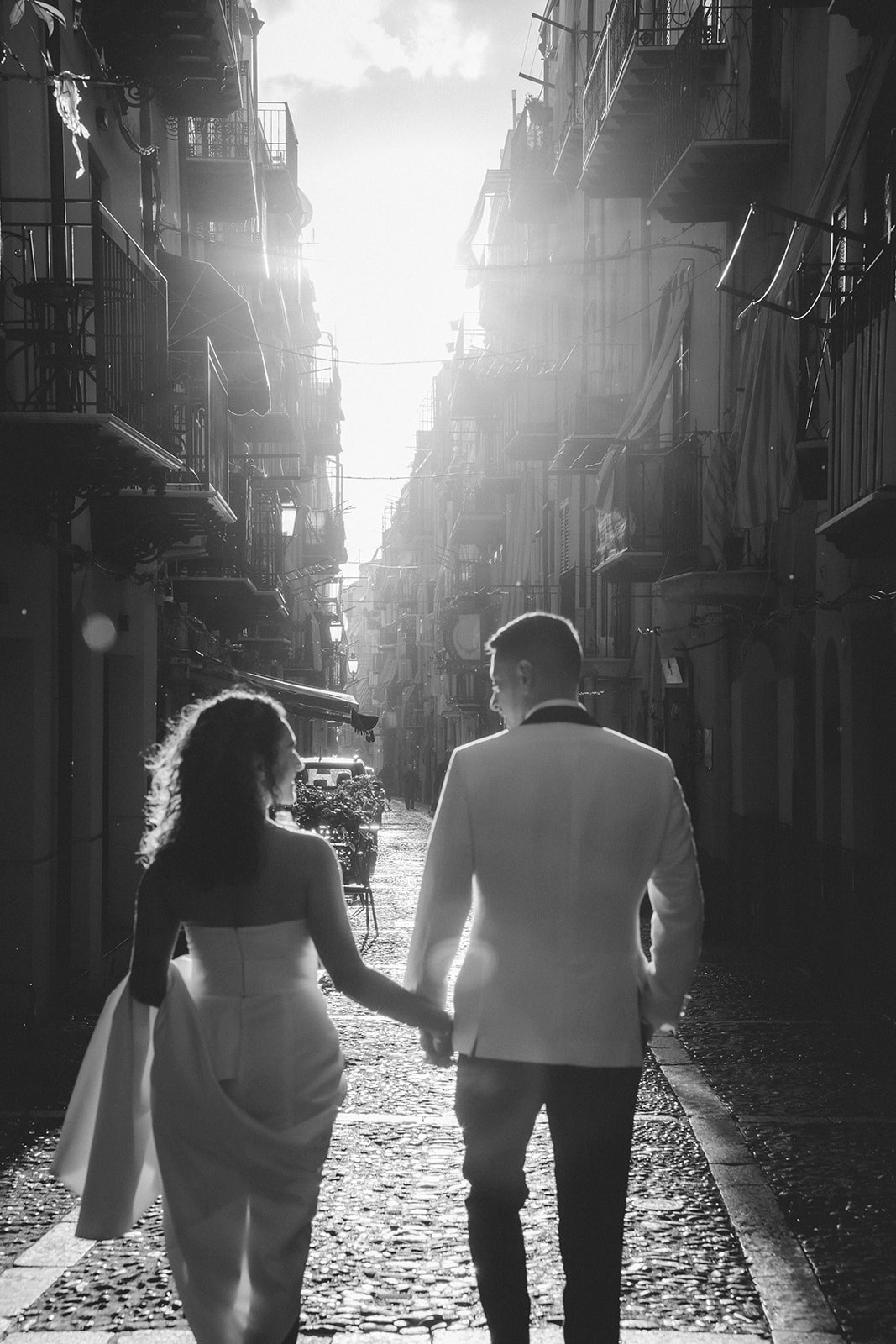 Black and white elopement photo of a couple walking through historic Cefalù