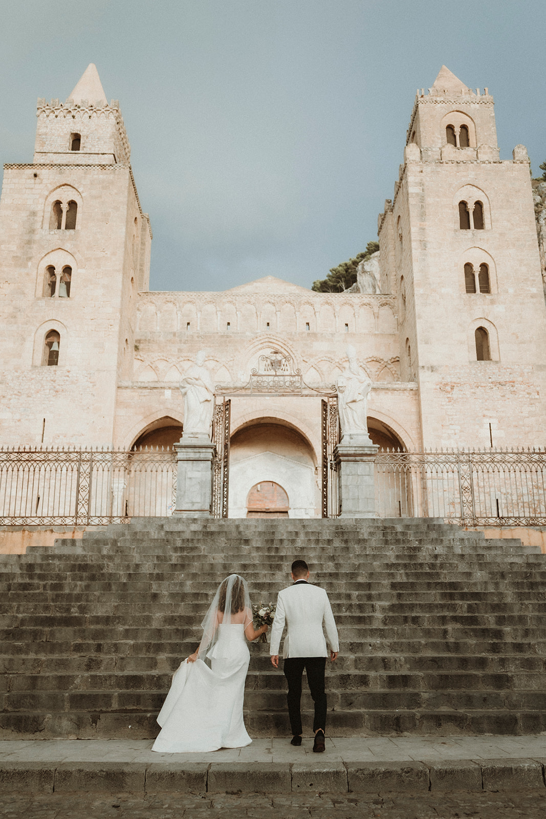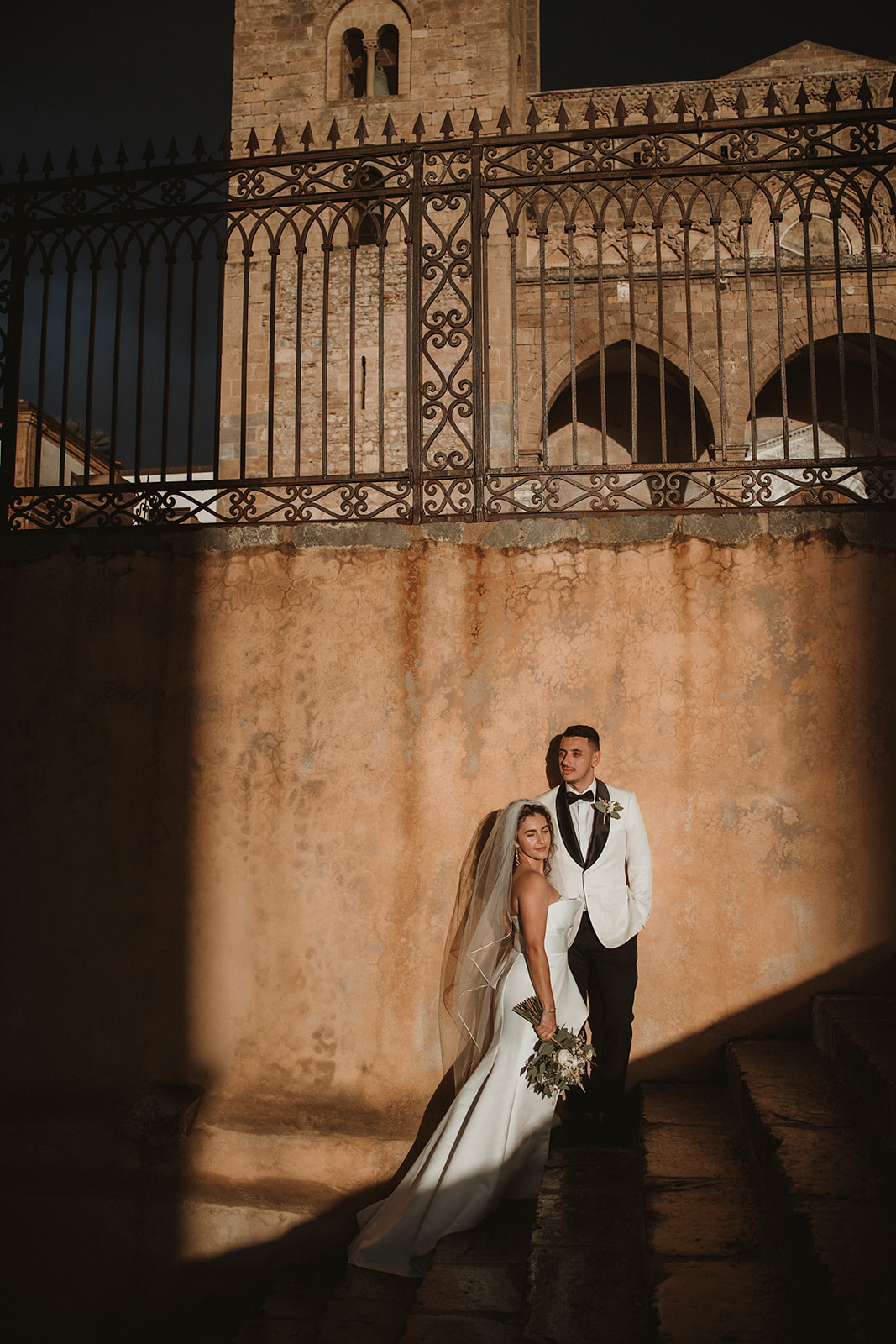 Elopement couple standing on the steps of Cefalù Cathedral after rain, Sicily