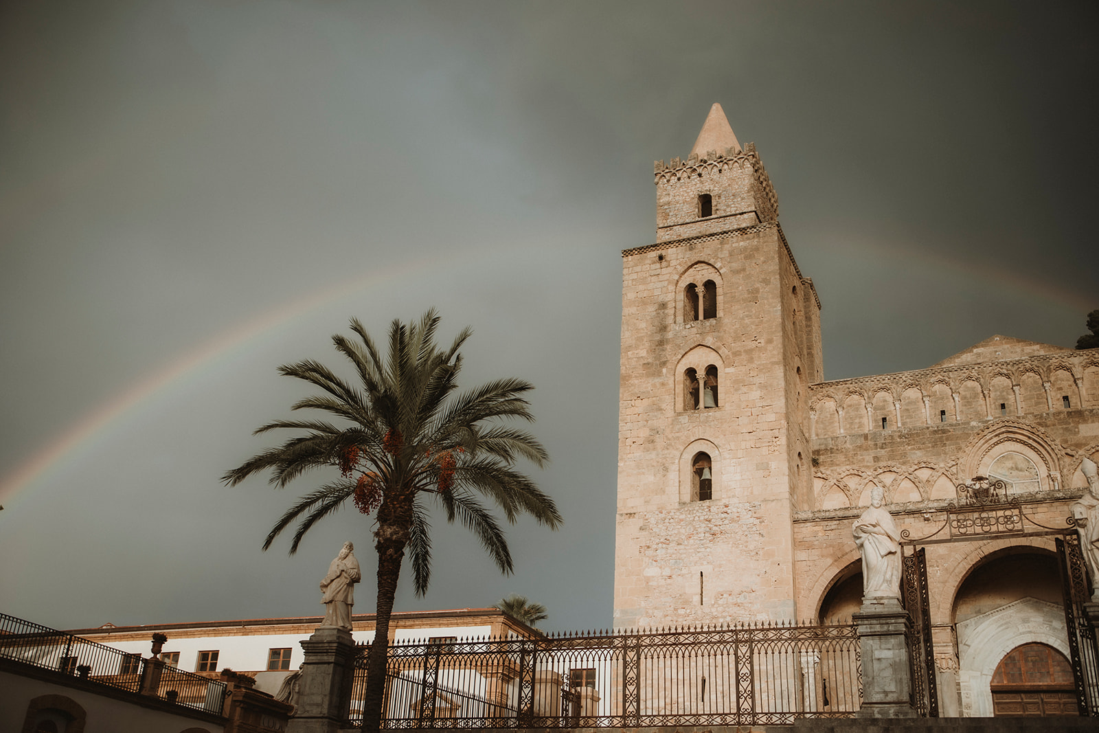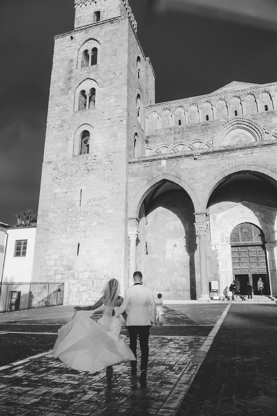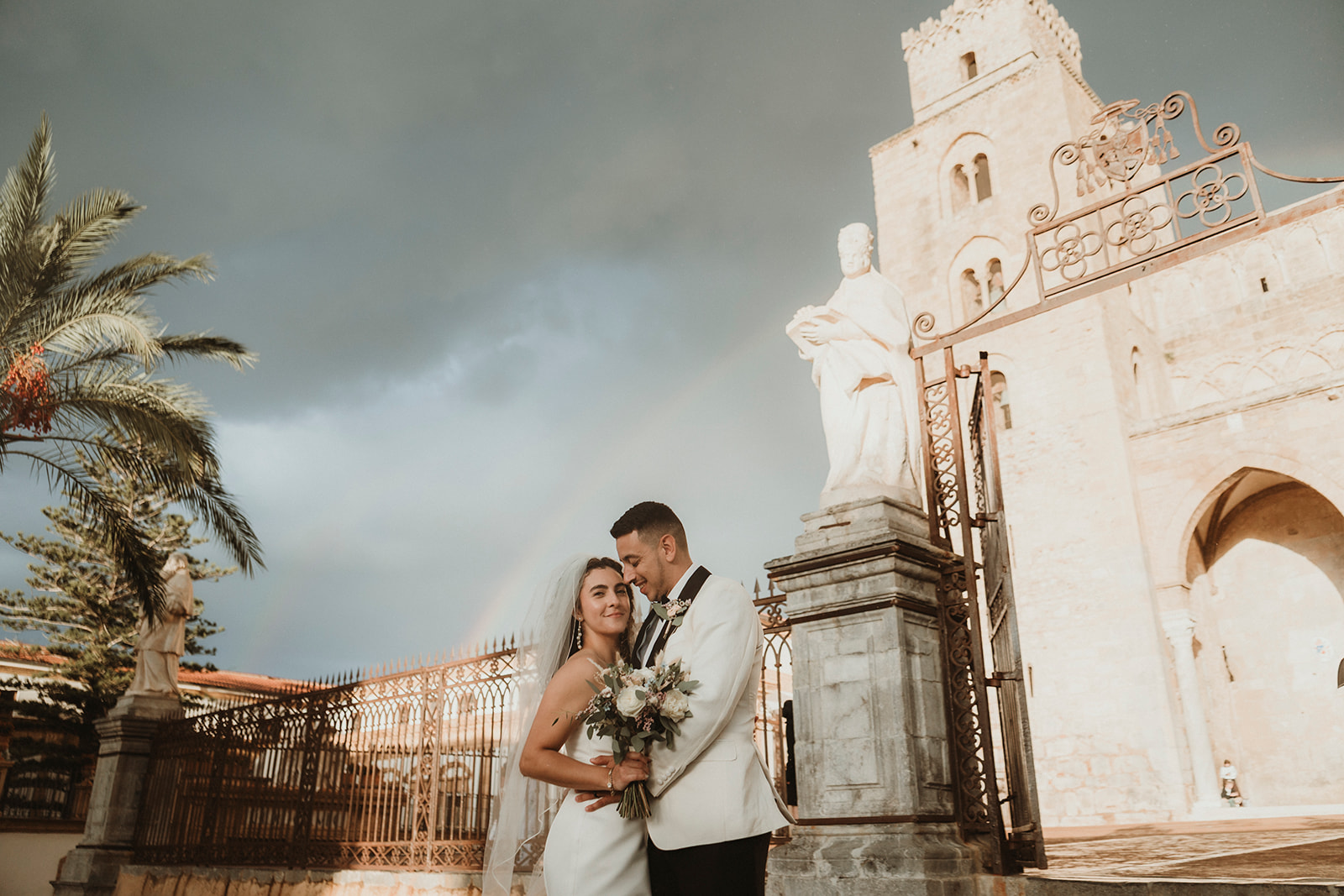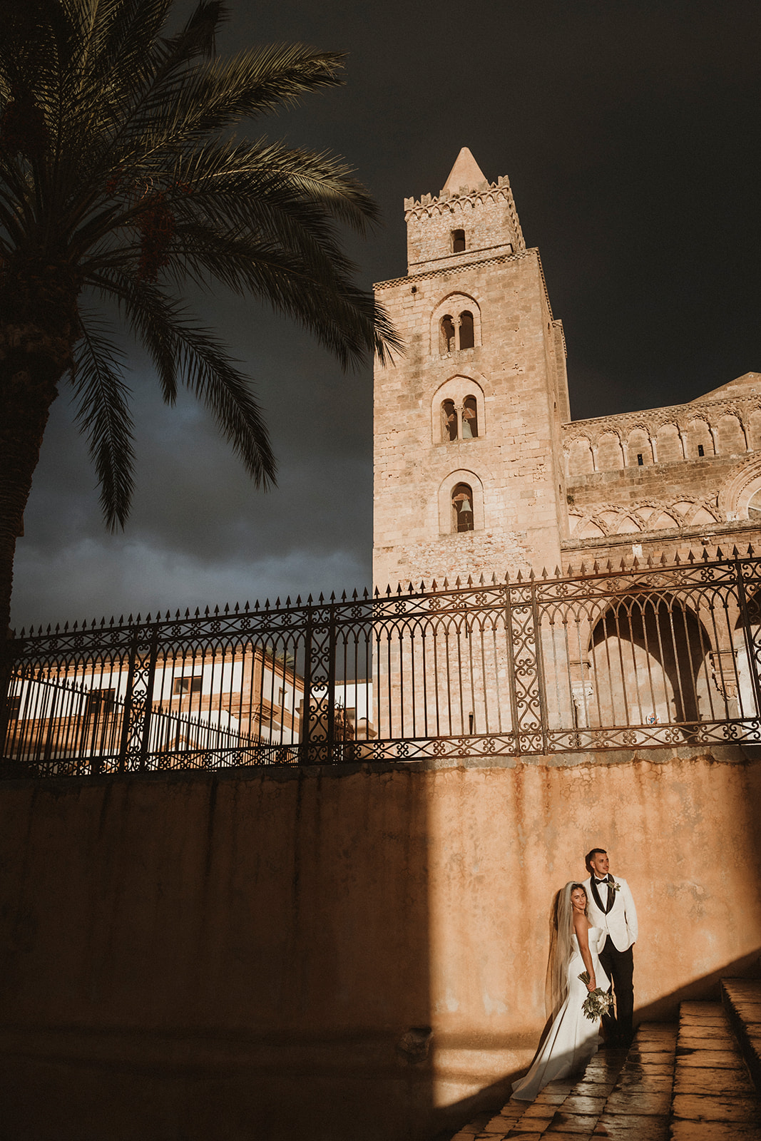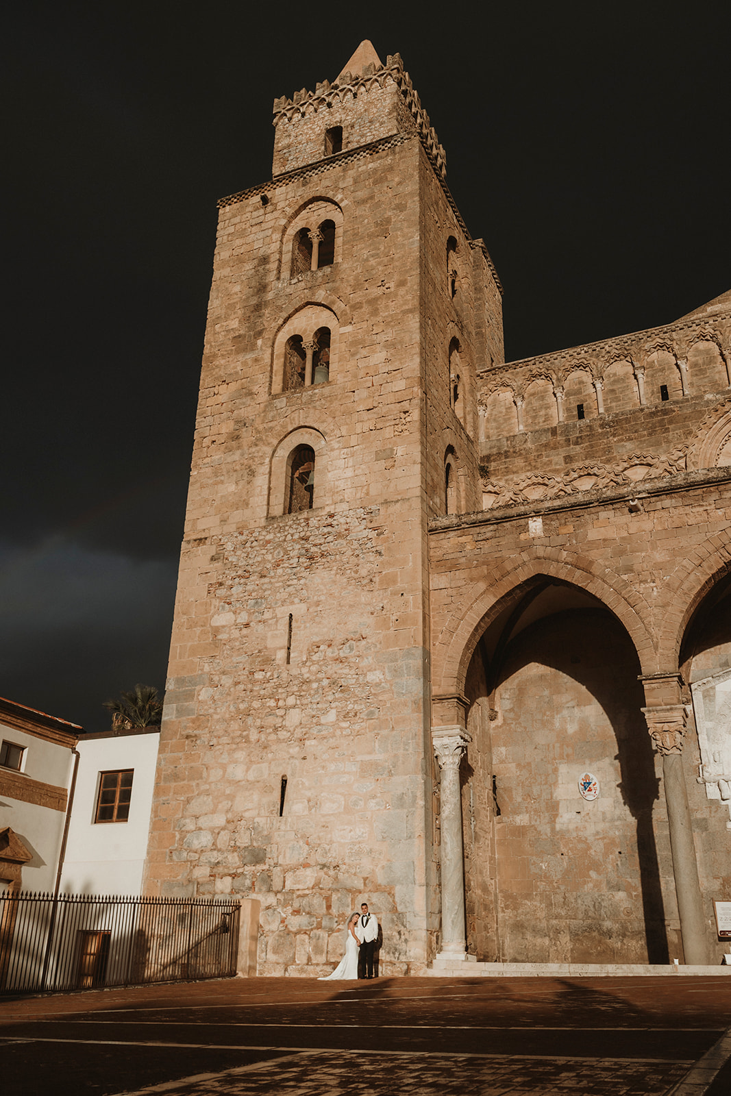Cefalù Cathedral at sunset with elopement couple beneath a dramatic sky