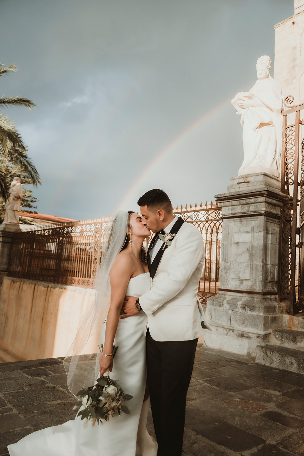 Couple kissing with a rainbow in the background on the steps on the cefalù cathedral on their elopement day