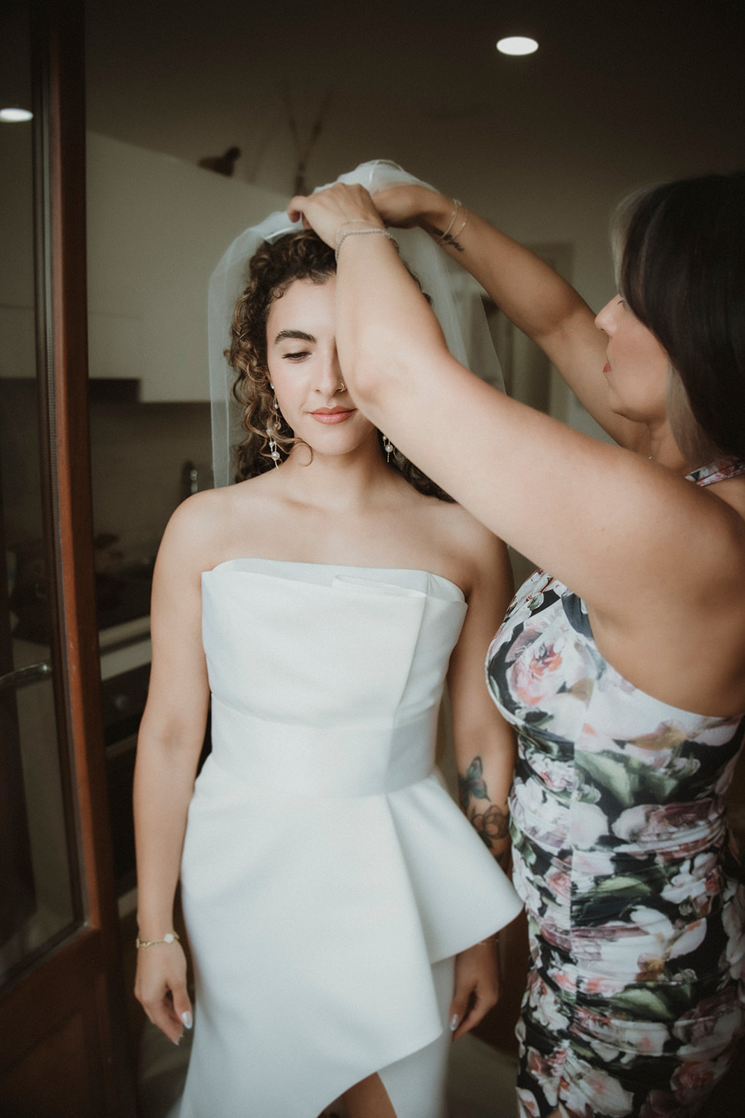 Intimate and tender shot of the sister of the bride carefully adjusting the bridal veil just before the symbolic in the garden of a Sicilian villa on a family elopement in Cefalù