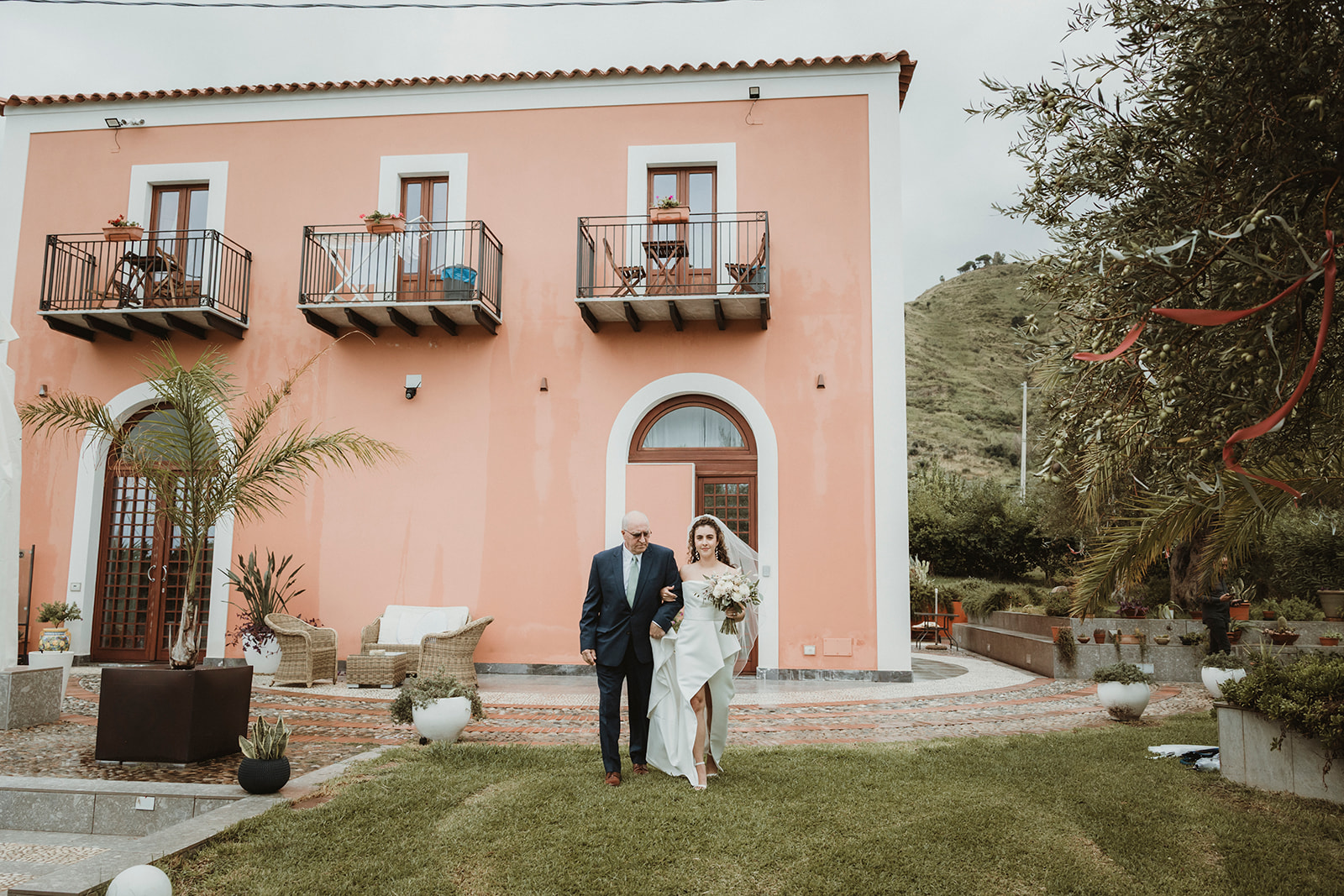 bride walking down the isle with her father on her elopement in Cefalù, set in the gardens of a rural villa 5 mins drive from the old town