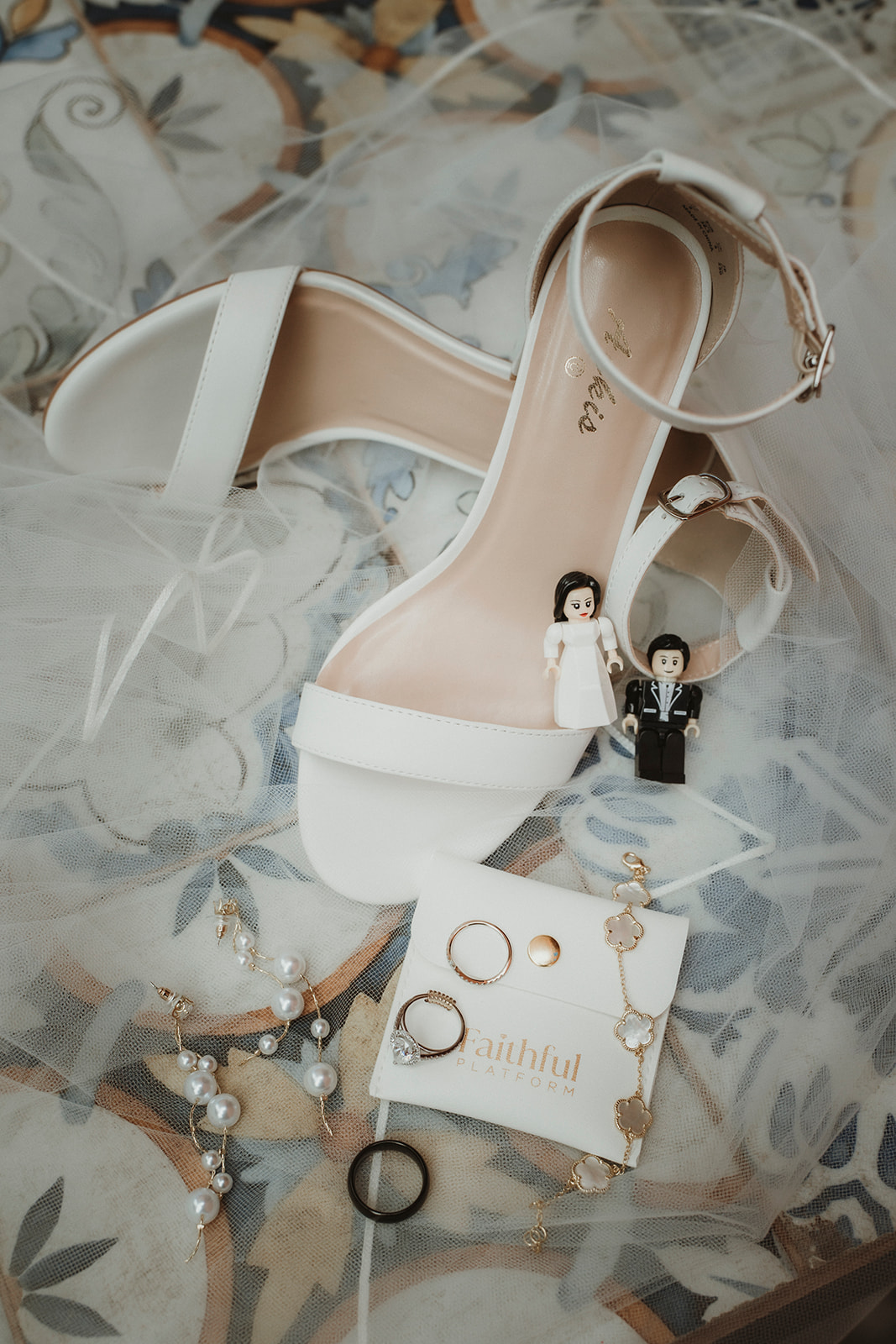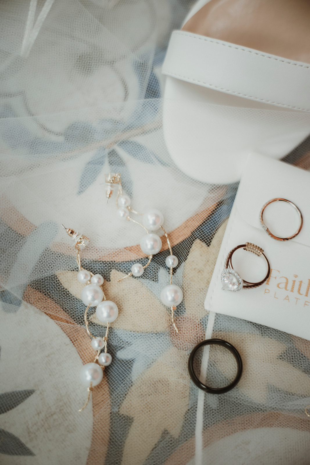 Detail shot of shoes, earings and rings of a bridal look for an elopement in Cefalù