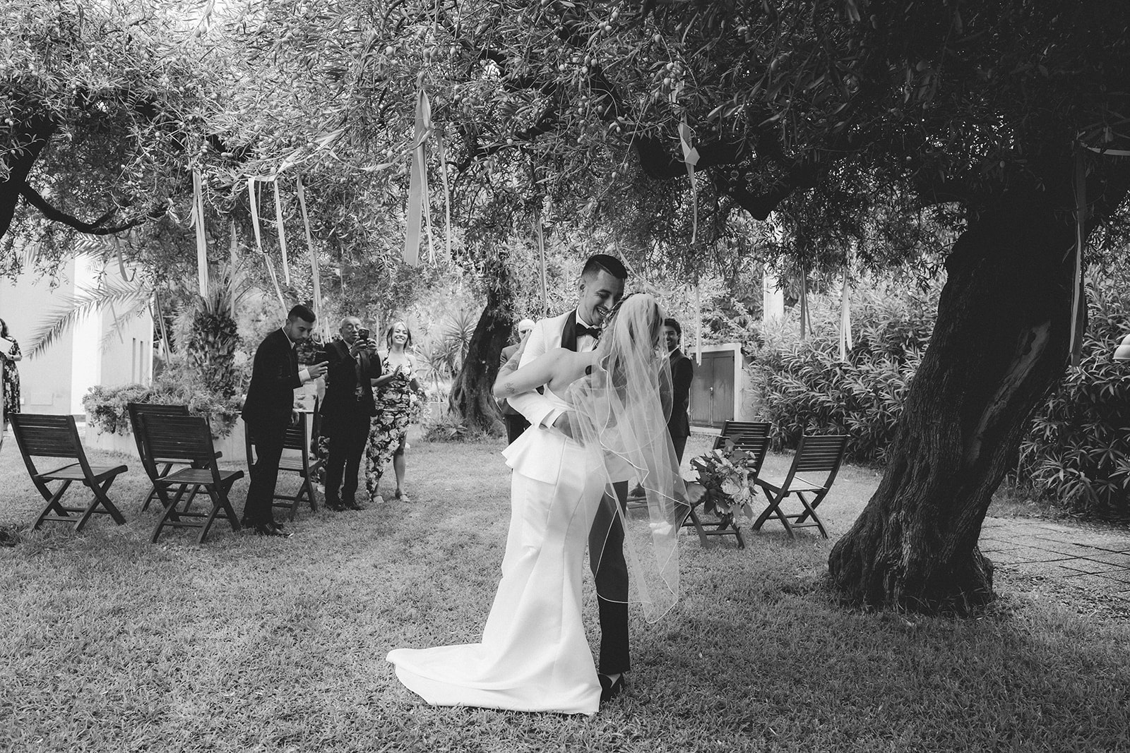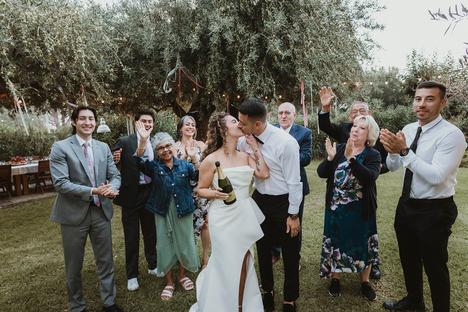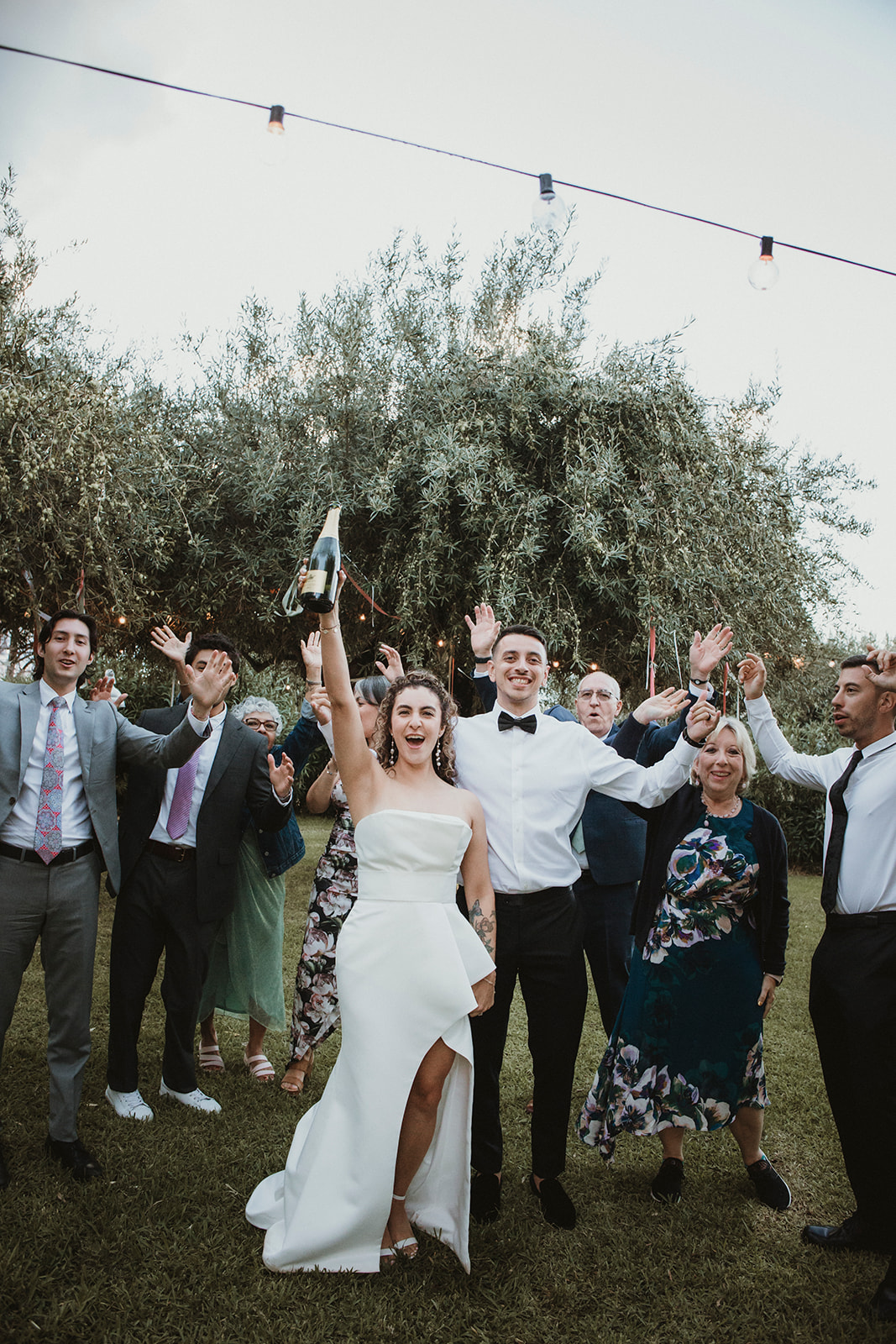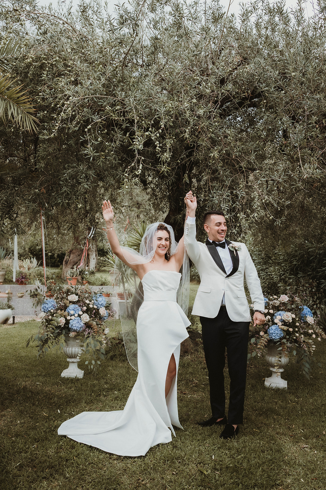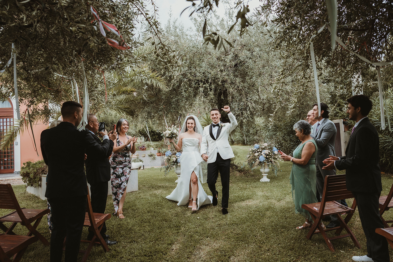 Bride and groom cheering just after their symbolic ceremony in the gardens of a Sicilian villa with the closest family cheering with them