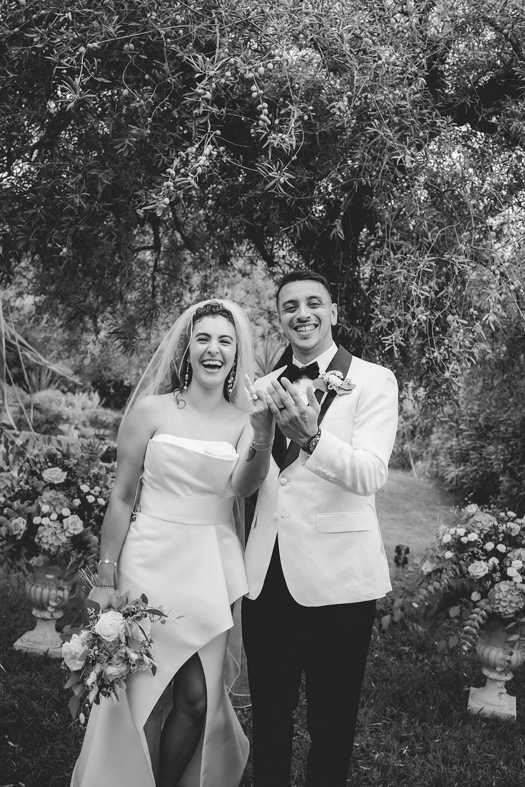 Smiley newlywed couple showing off their wedding ring right after their ymbolic ceremony in the gardens of a typical Sicilian villa