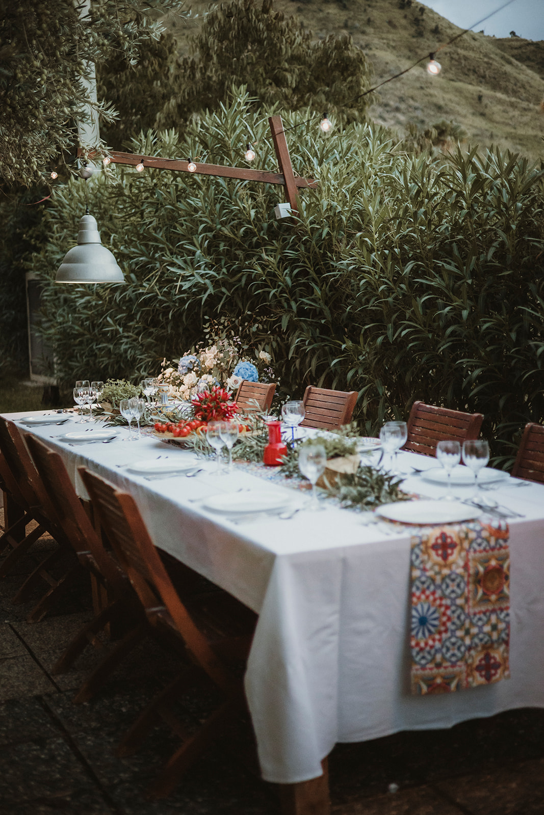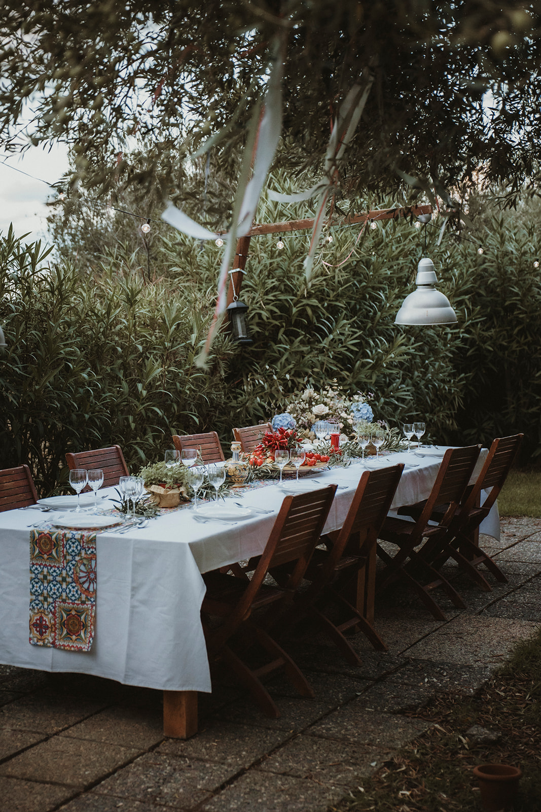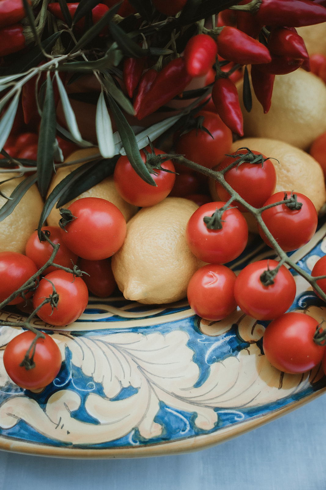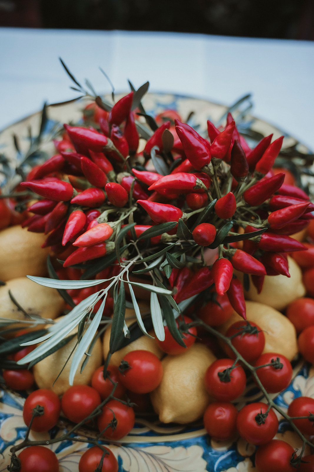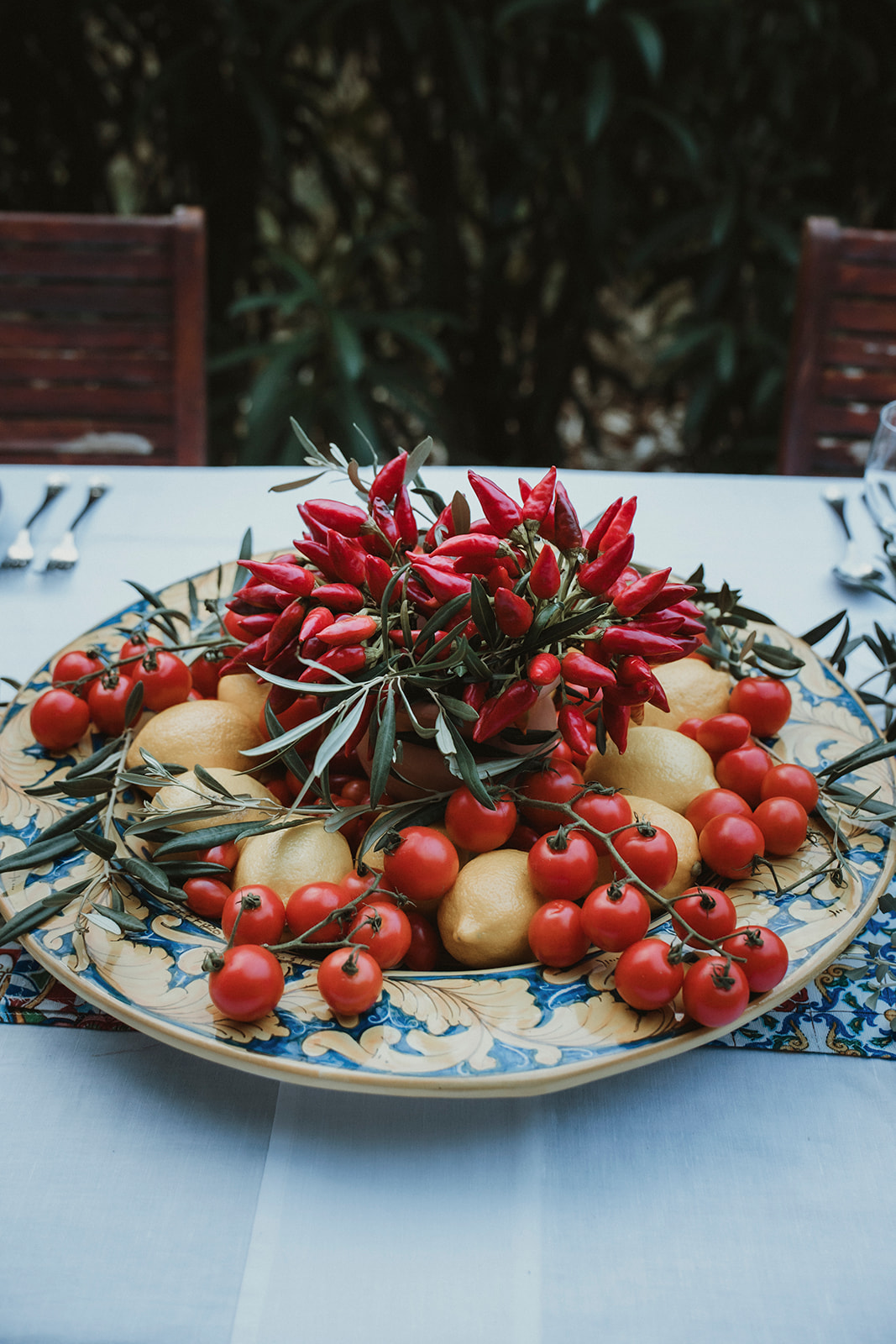 Instead, we styled the dinner table using what was already around us: olive branches harvested from nearby fields, tomatoes, peppers, lemons, and small potted aromatic herbs. Everything felt unmistakably Sicilian, simple, and honest.
