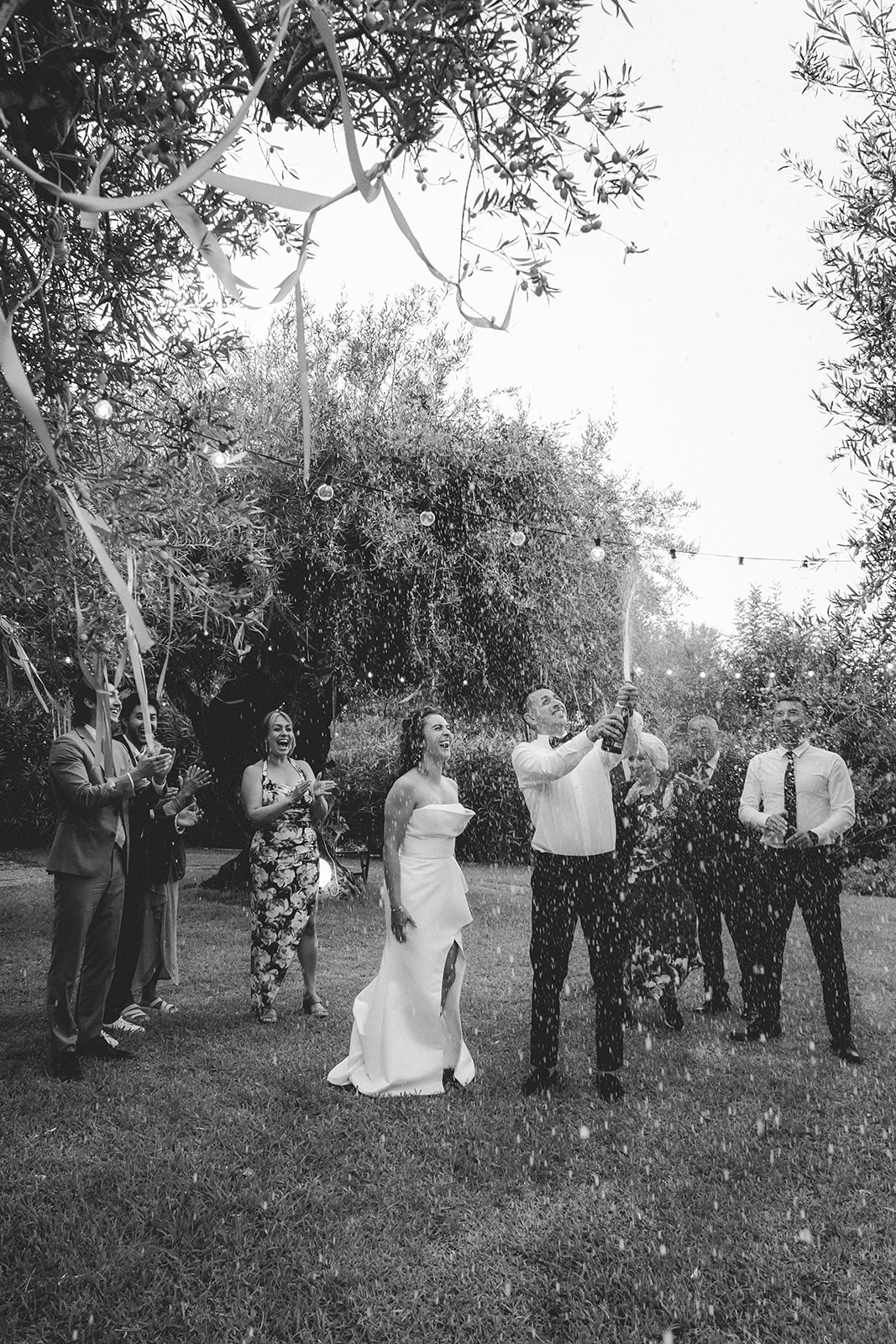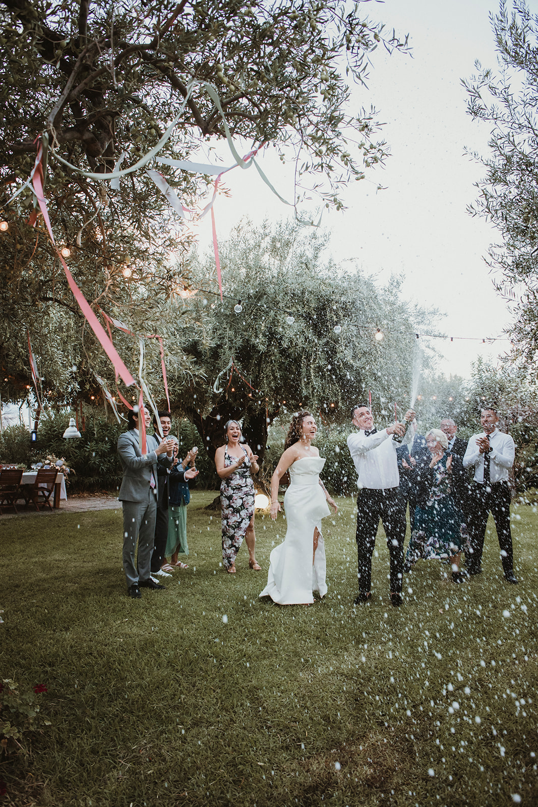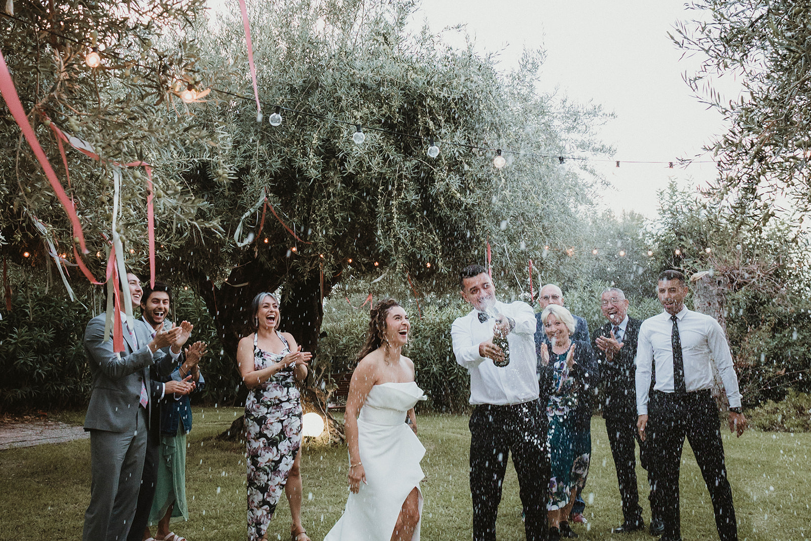 Couple spraying champagne withe their closest family to celebrate their union on their elopement in Cefalù
