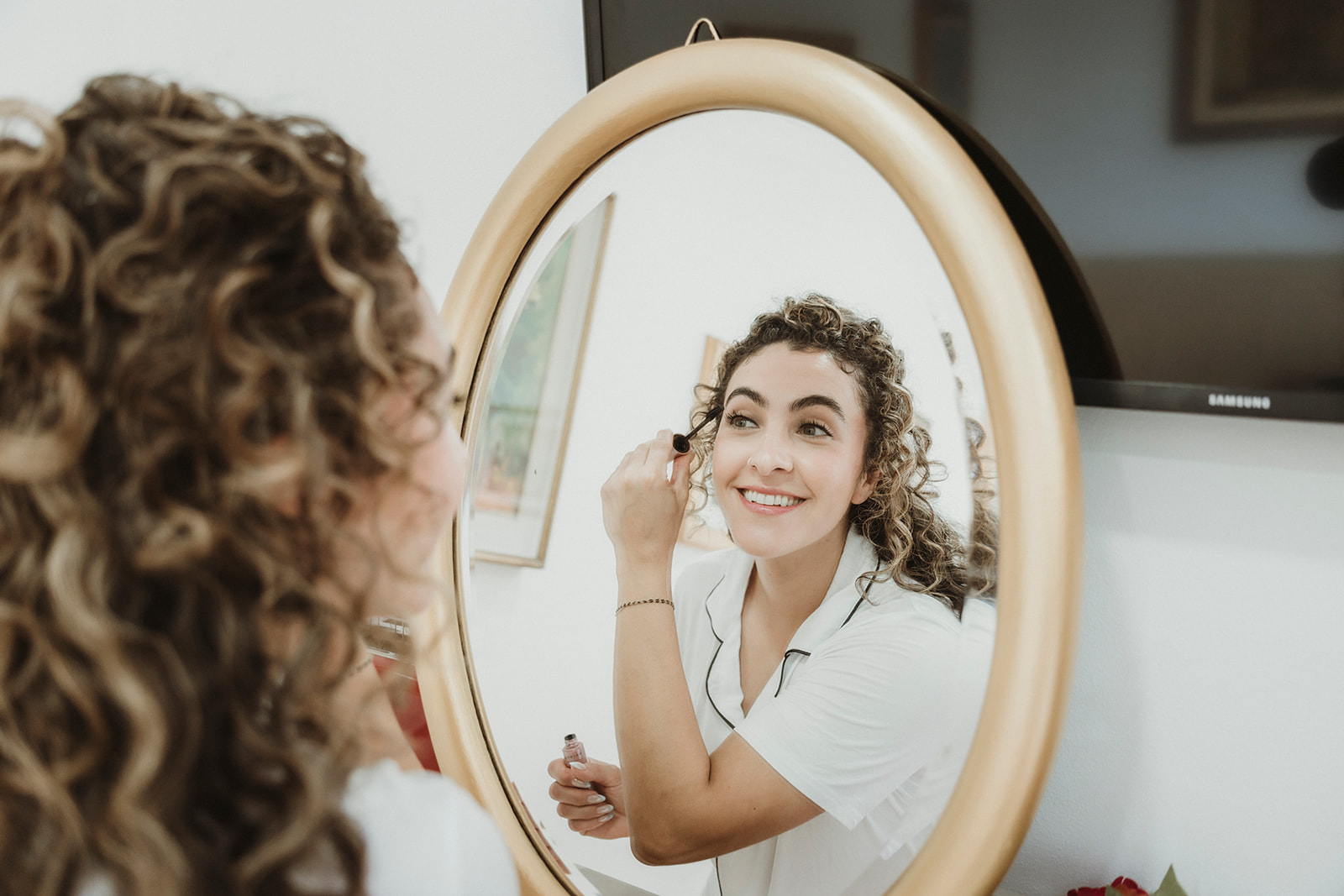 Bride smiling at the mirror as she gets ready on her elopement day in Cefalù, Sicily