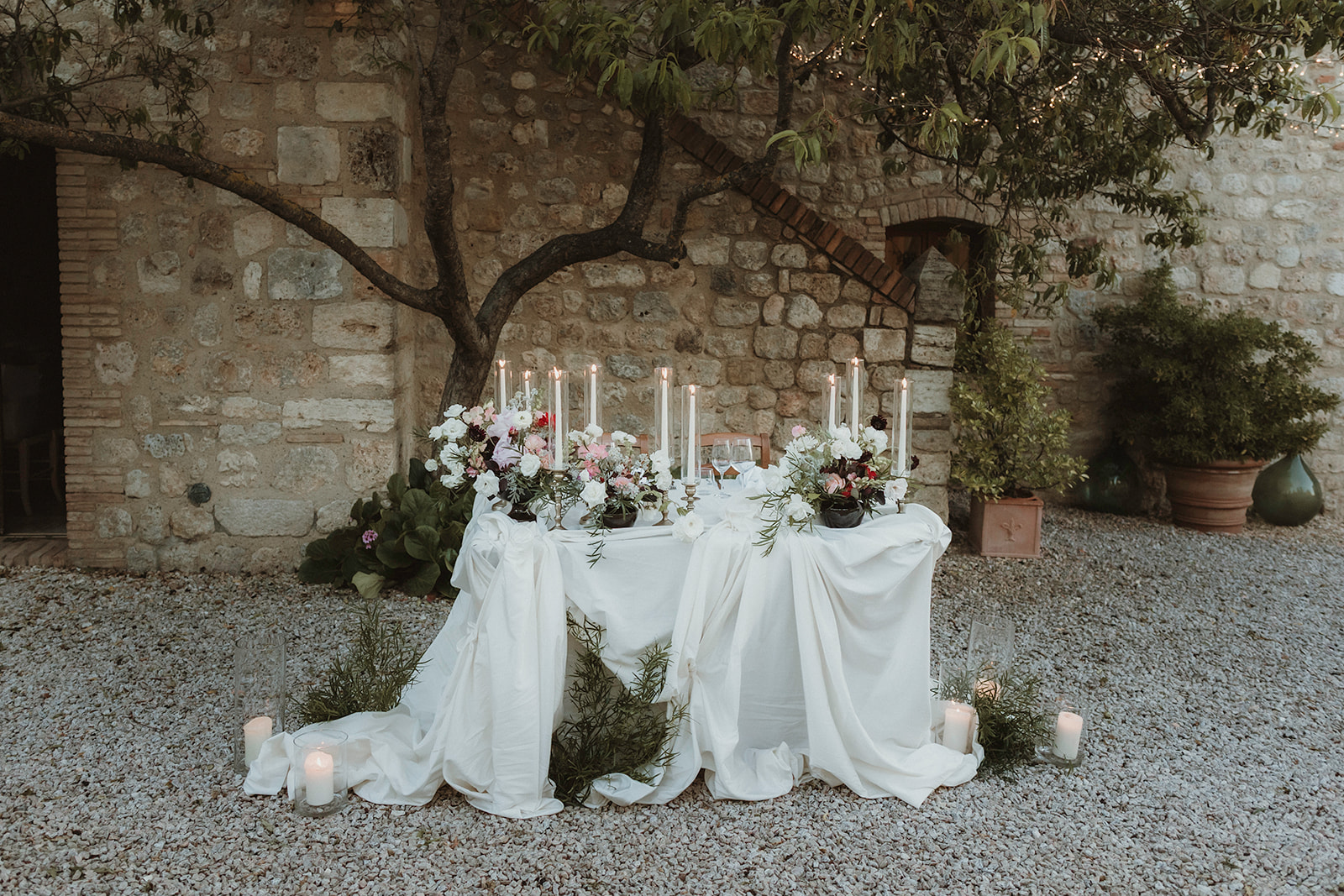The nearby roofless Gothic abbey is one of the most unique ceremony locations in Tuscany, and many couples choose to exchange vows there before celebrating with an intimate dinner in the surrounding countryside.