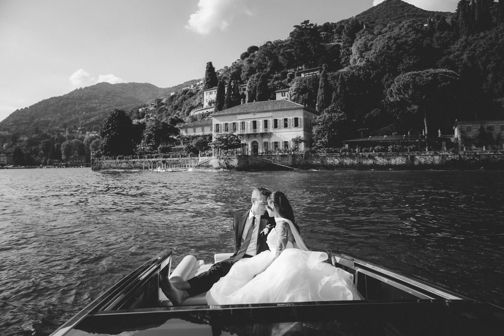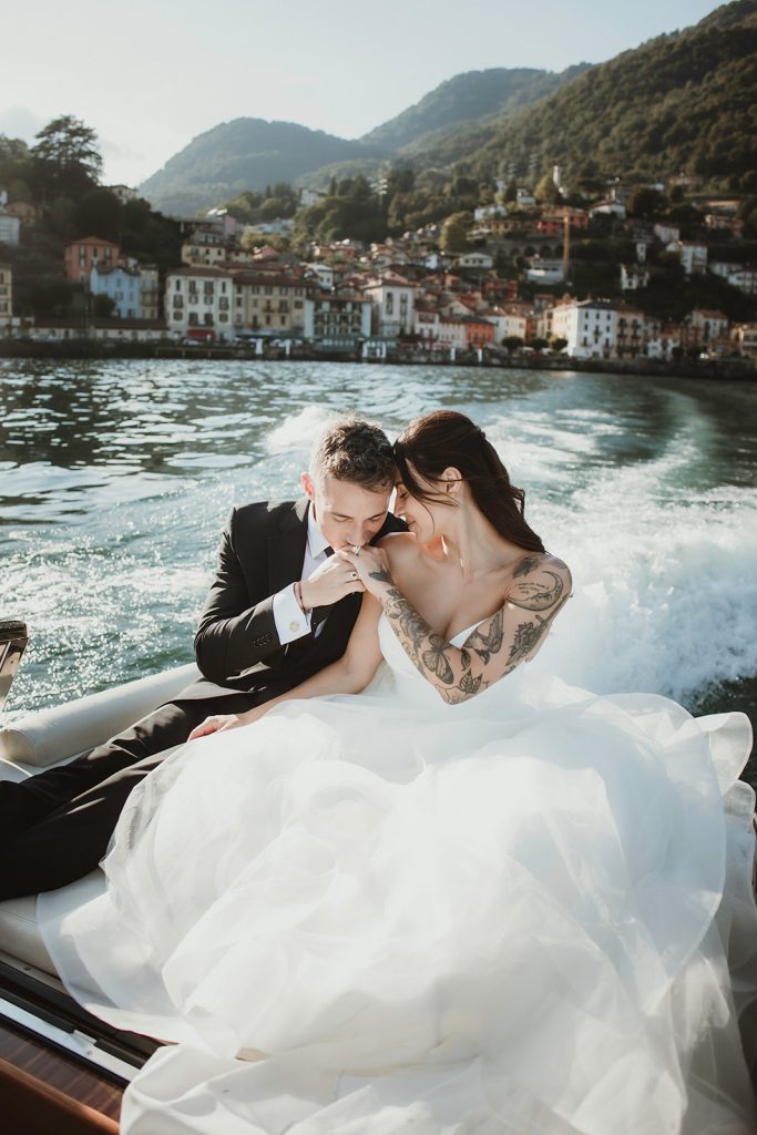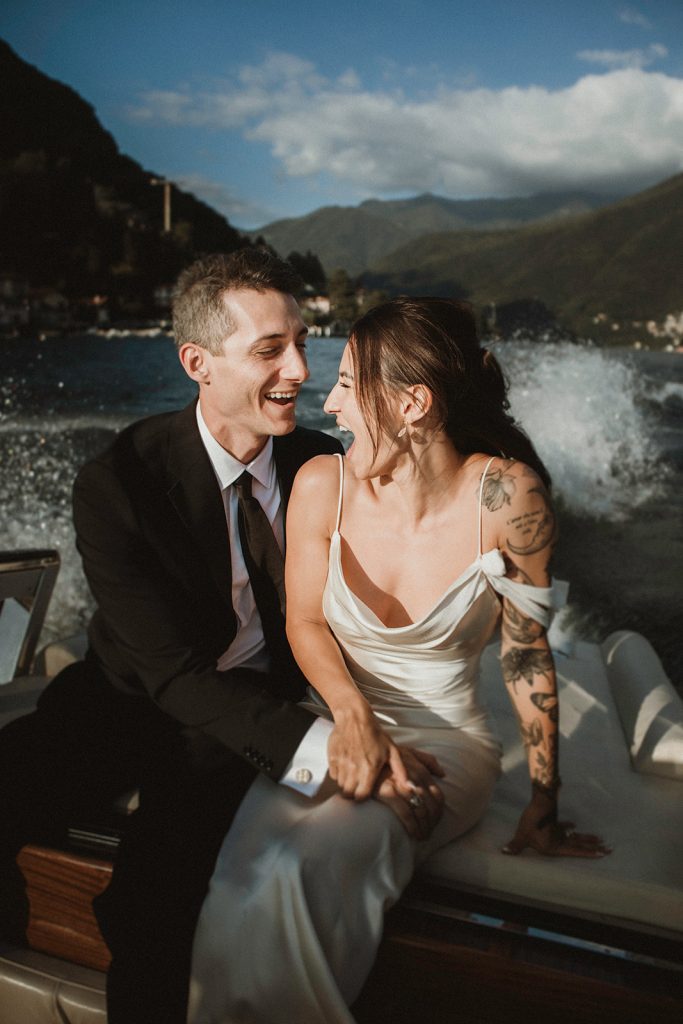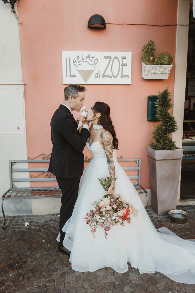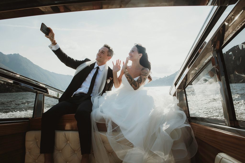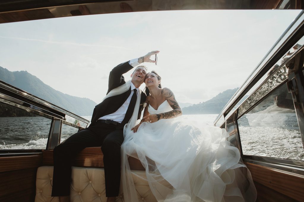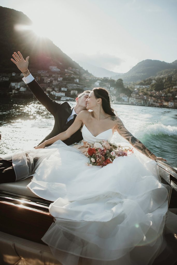 After making the most out of this incredible villa, we all set off on a private Lake Como boat tour at sunset. There is not such thing as a Lake Como elopement without a boat tour on its shimmering waters. Exploring the lake is a must, as you get to experience its unique shores from a completely different point of view. It gives you also the chance to stop and stroll around one of its many little and typical towns, that simply you can’t not visit if you elope in Lake Como! We chose to stop in one of our favourite places, a picturesque village that offered Sadie & Lane a chance to stretch their legs, enjoy the view, and cheer to their day with an ice-cream before continuing their ride as the sun was setting.
