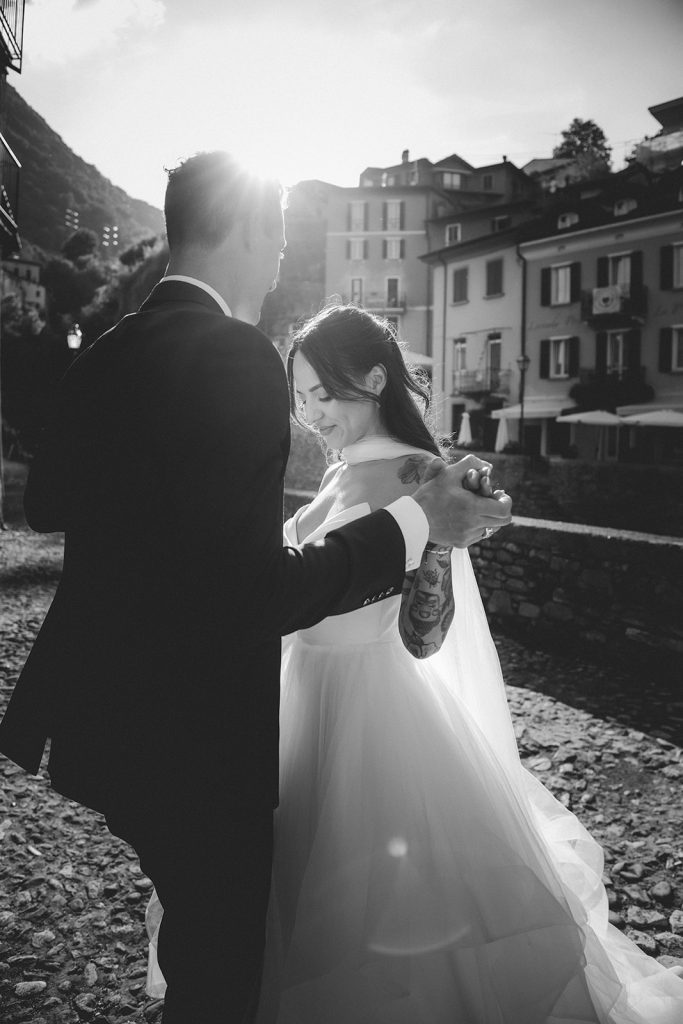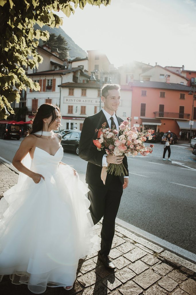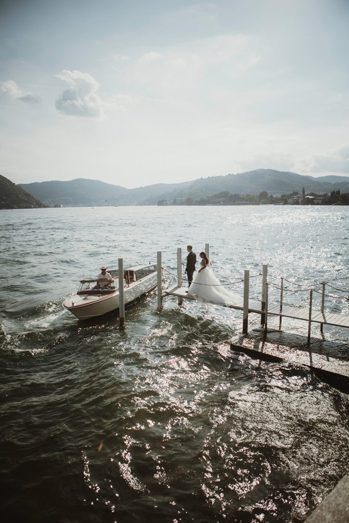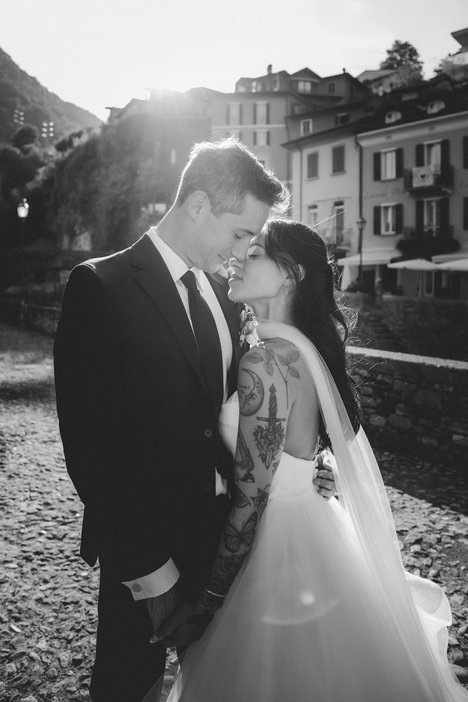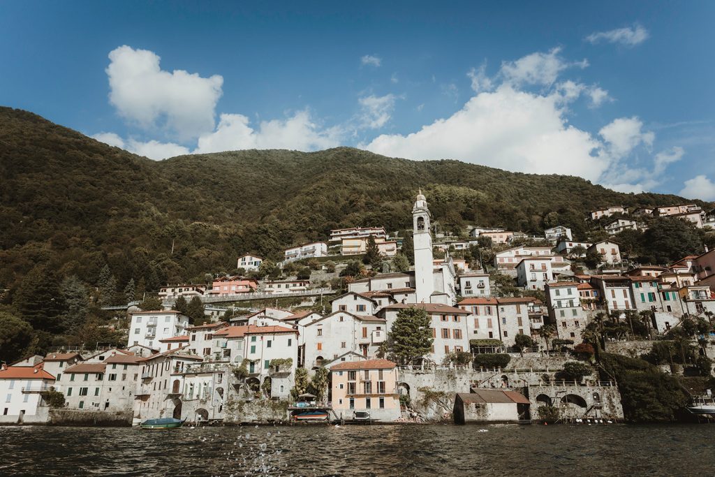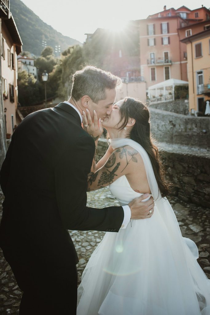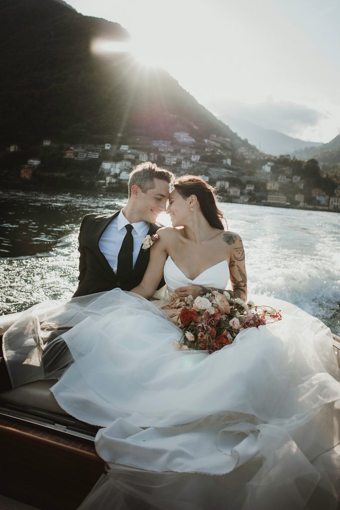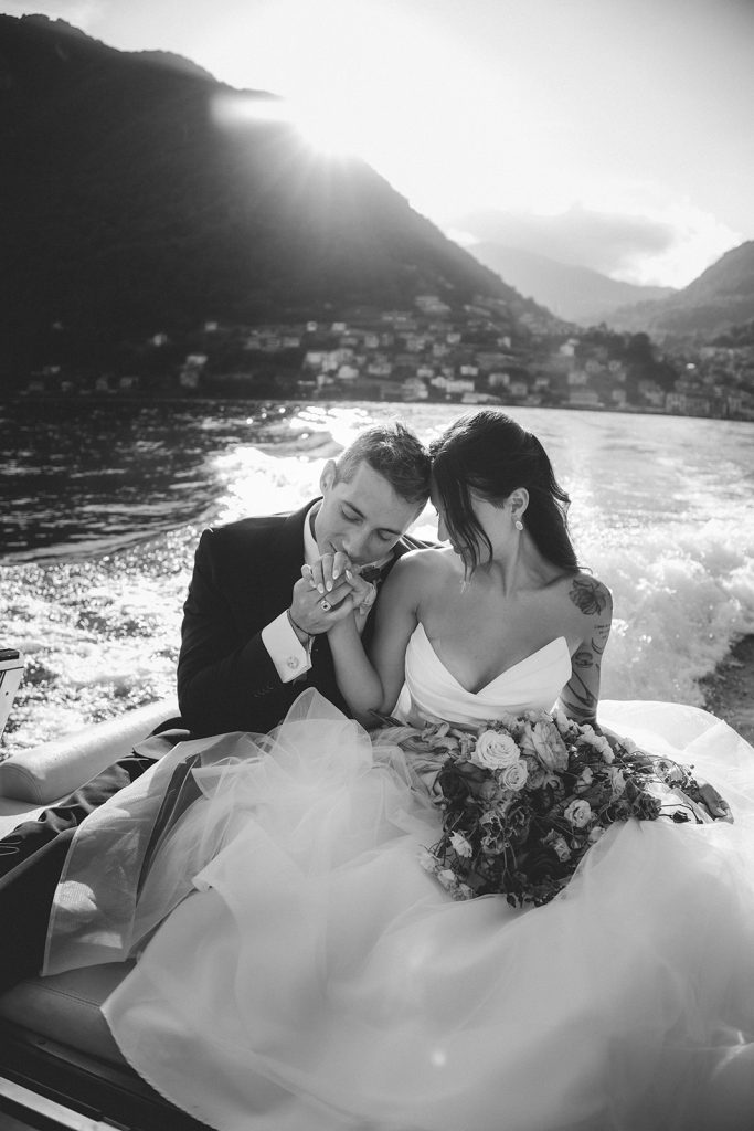 After making the most out of this incredible villa, we all set off on a private Lake Como boat tour at sunset. There is not such thing as a Lake Como elopement without a boat tour on its shimmering waters. Exploring the lake is a must, as you get to experience its unique shores from a completely different point of view. It gives you also the chance to stop and stroll around one of its many little and typical towns, that simply you can’t not visit if you elope in Lake Como! We chose to stop in one of our favourite places, a picturesque village that offered Sadie & Lane a chance to stretch their legs, enjoy the view, and cheer to their day with an ice-cream before continuing their ride as the sun was setting.