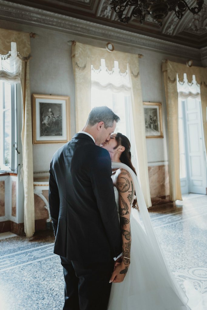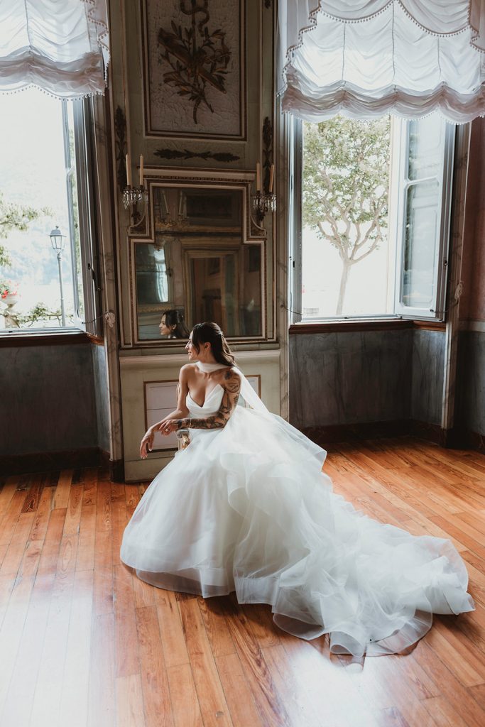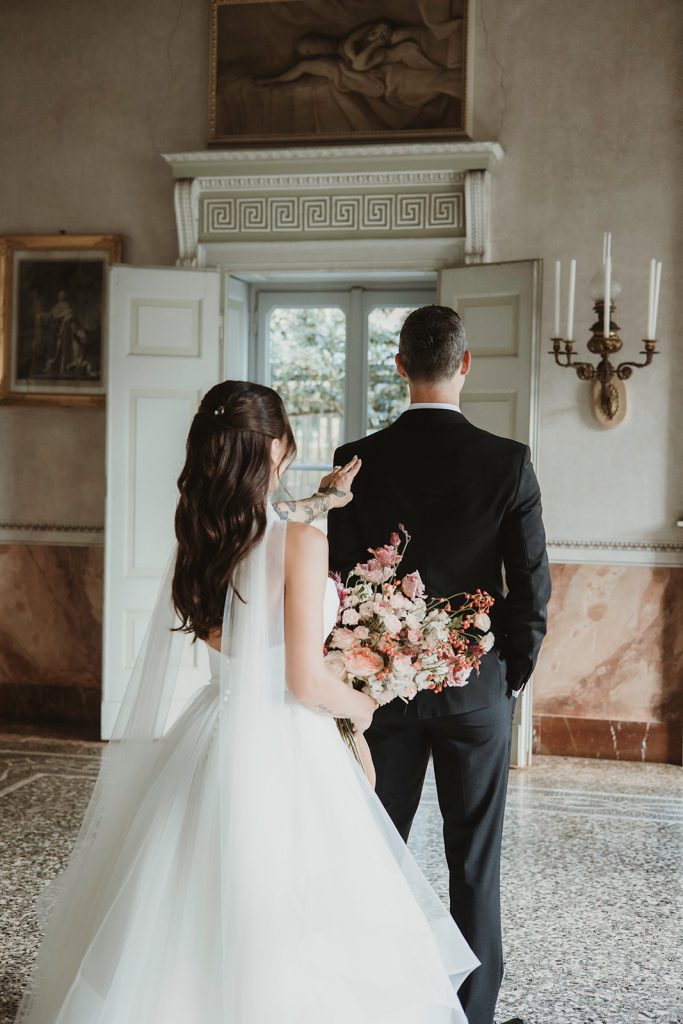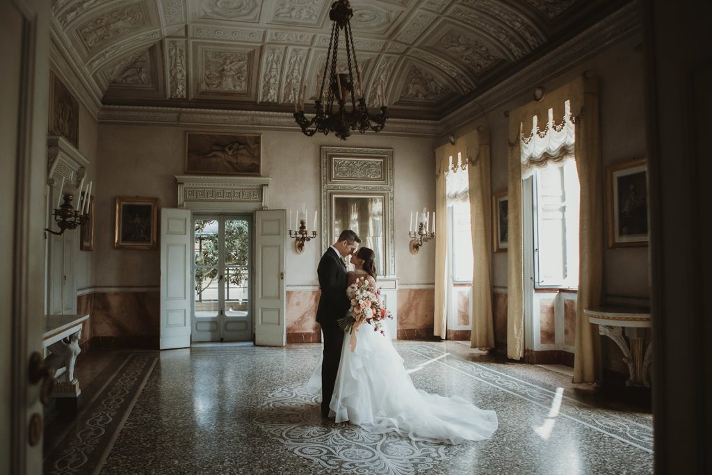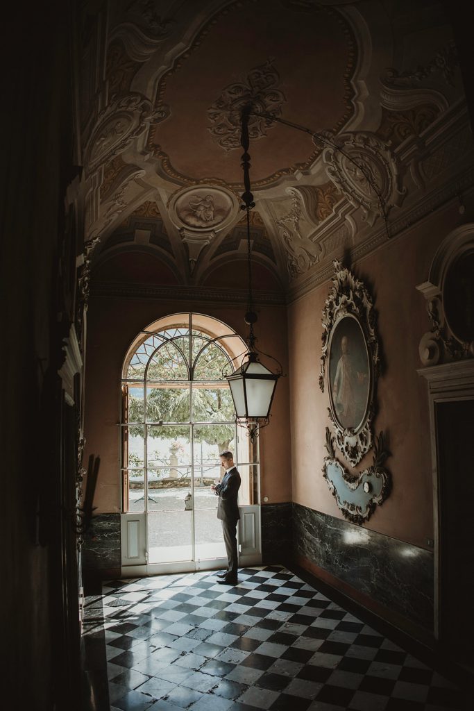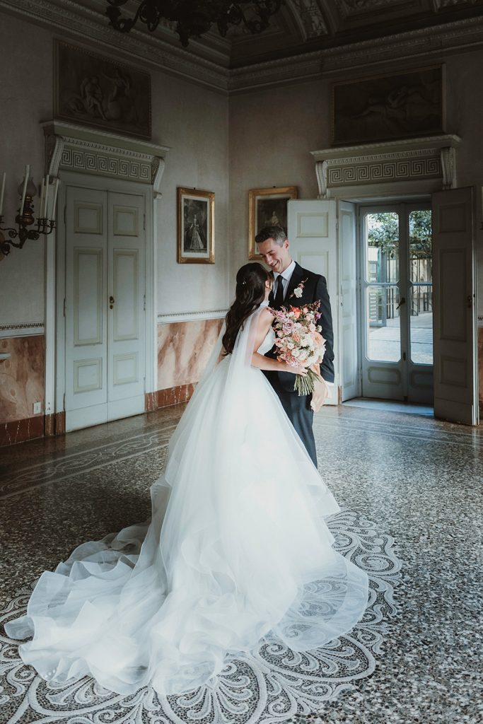 For this beautiful Lake Como elopement at Villa Pizzo, we couldn’t think of a better place for the first look than one of the many exquisite rooms of the luxury villa we carefully selected. The atmosphere of this historic villa feels almost surreal, a perfect reflection of Sadie & Lane’s quiet, heartfelt elegance.