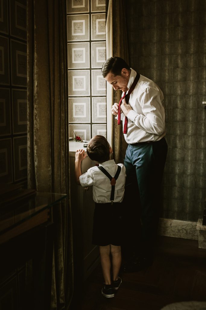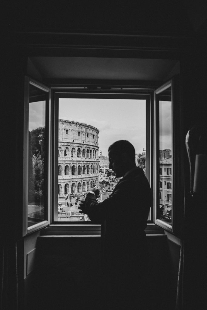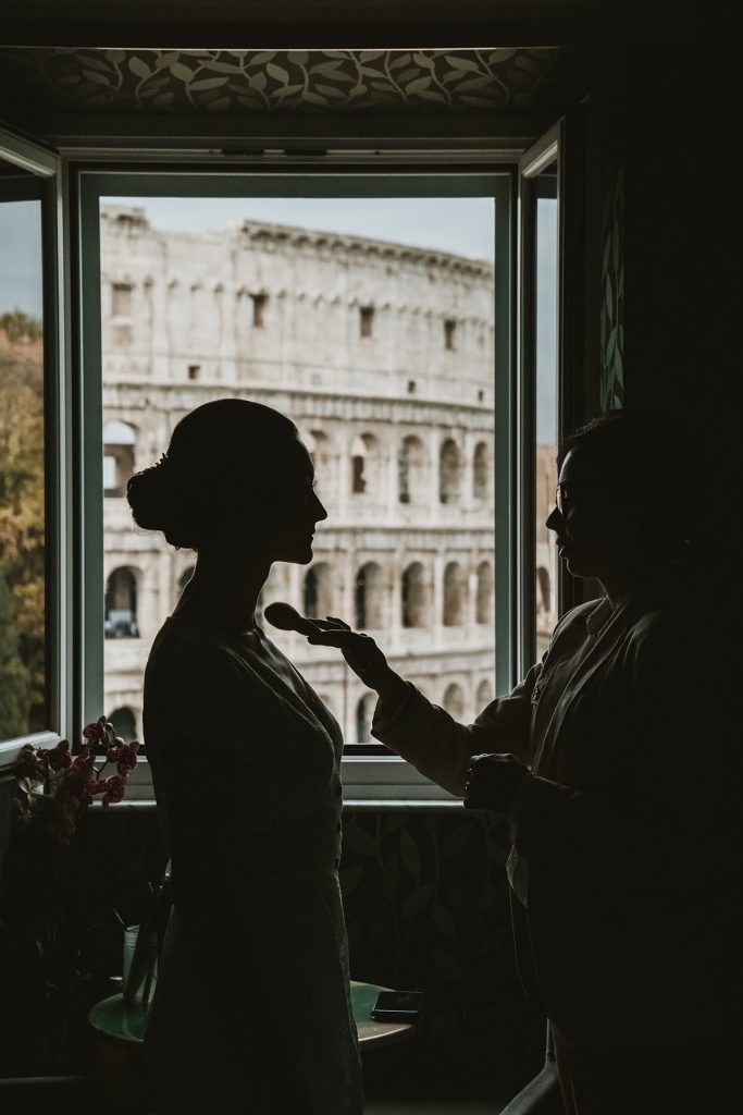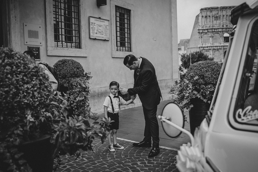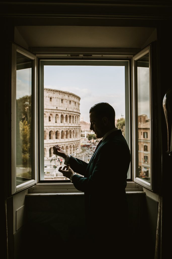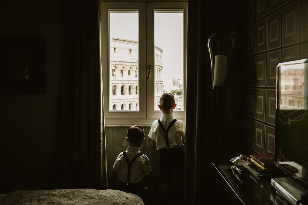 They got ready at Palazzo Manfredi(Rome) where they had one room overlooking the Colosseum. The room was designed in a way that they could not see each other while getting ready and still both share this same moment with both their two children.