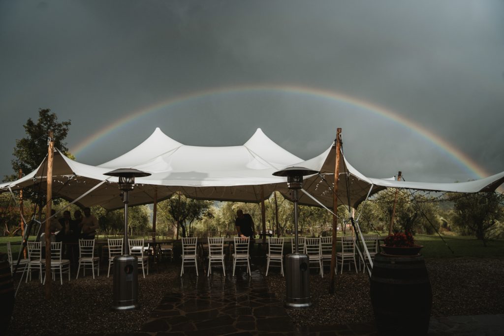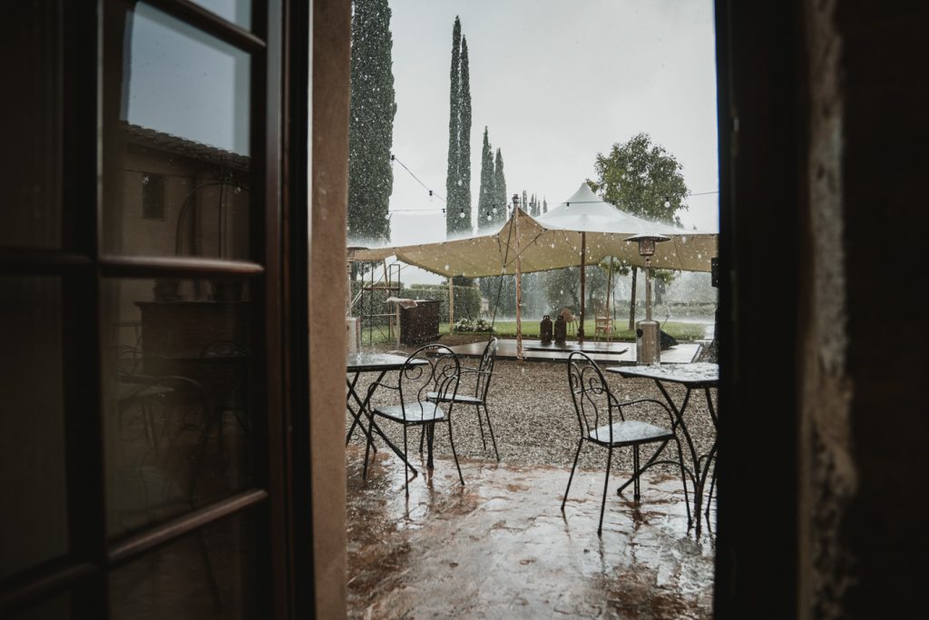 View of a marquee tent for a wedding reception on a very rainy day in Italy